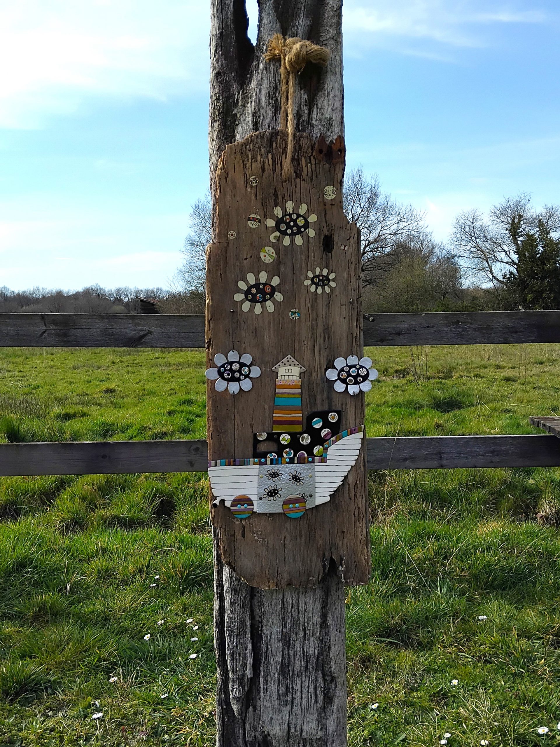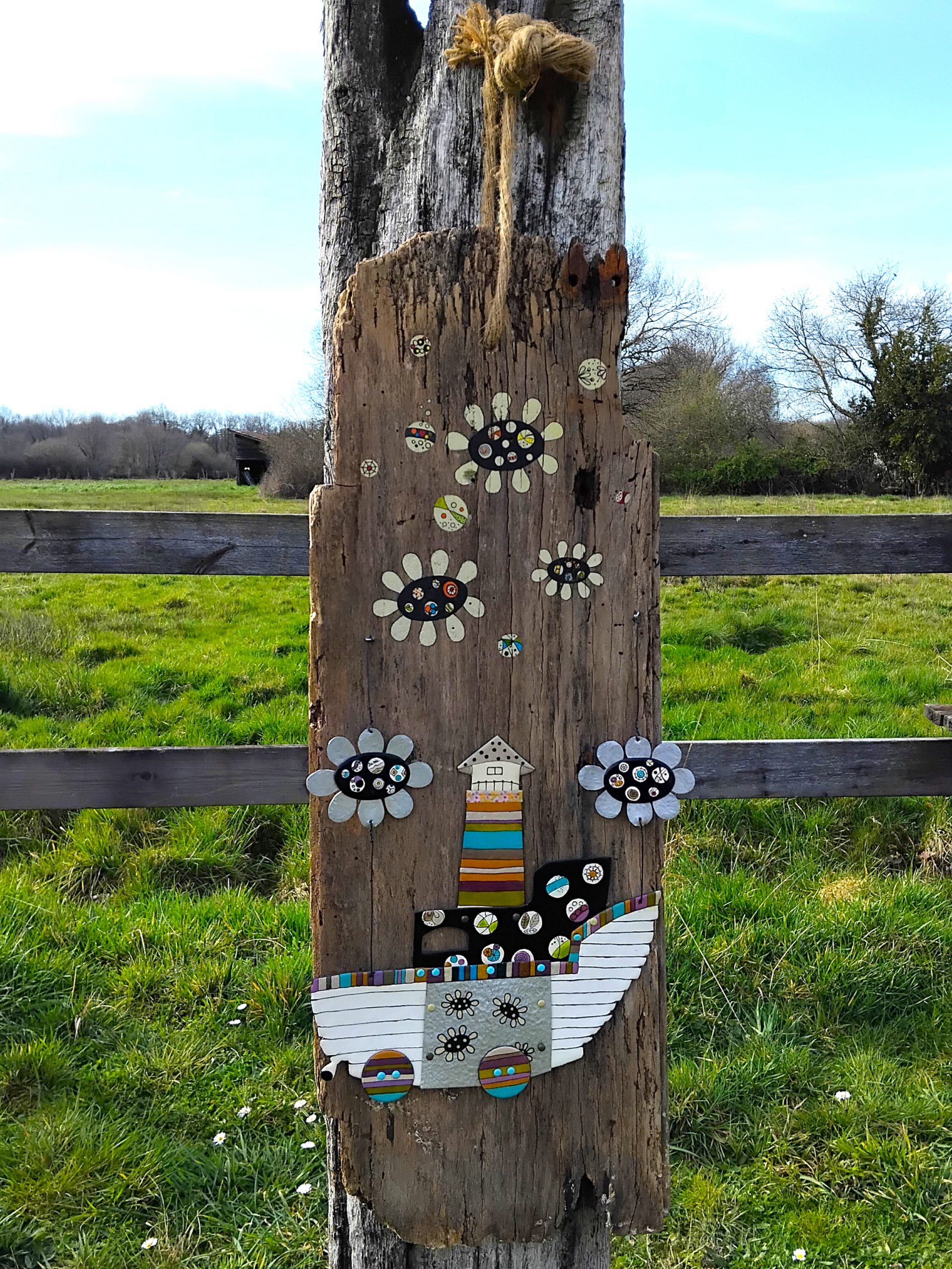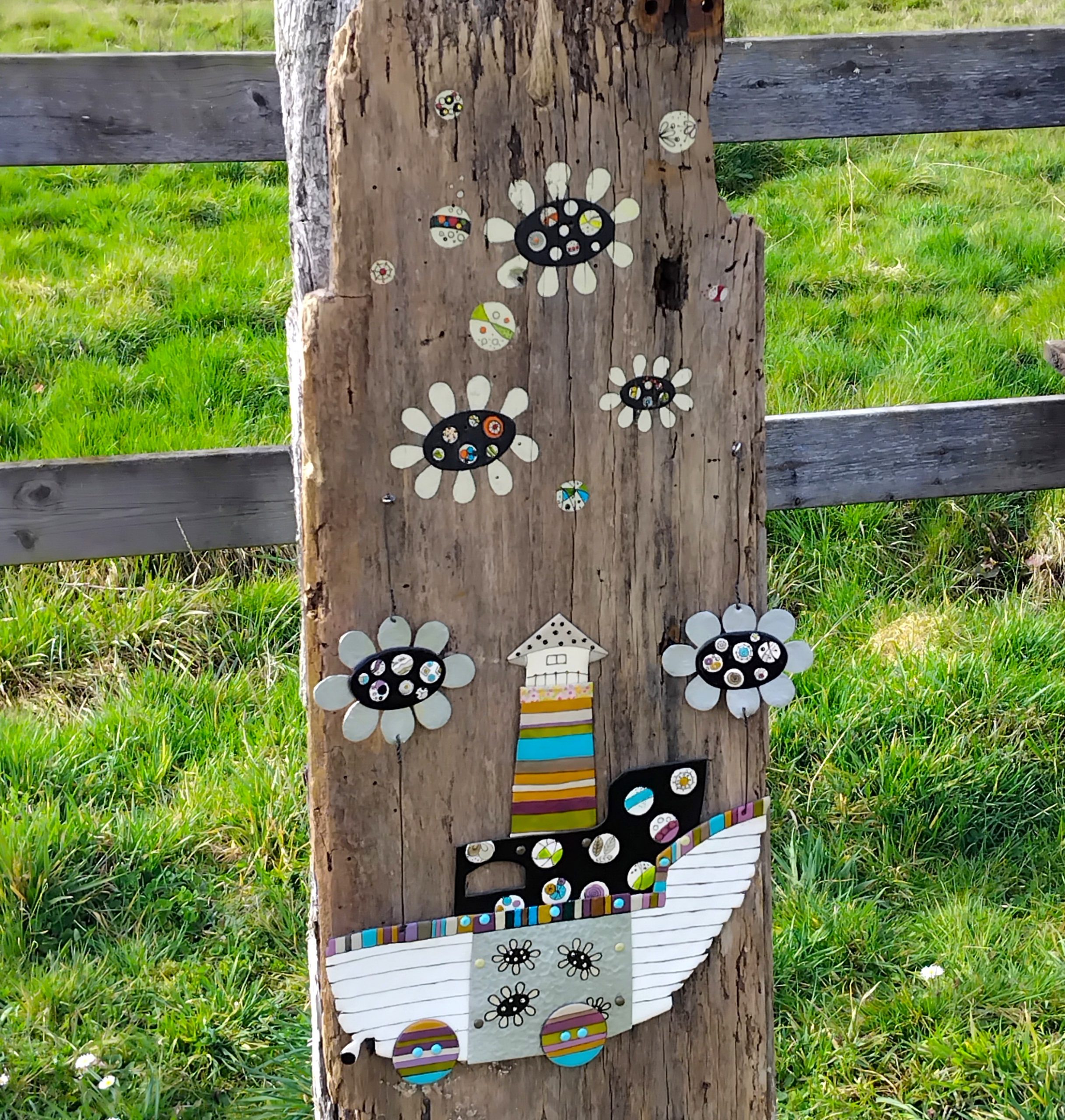 Mélange d’émail, de bois flotté peint et de métal, ce  bateau imaginaire s’accroche sur un mur intérieur, il apportera de la poésie dans votre maison.