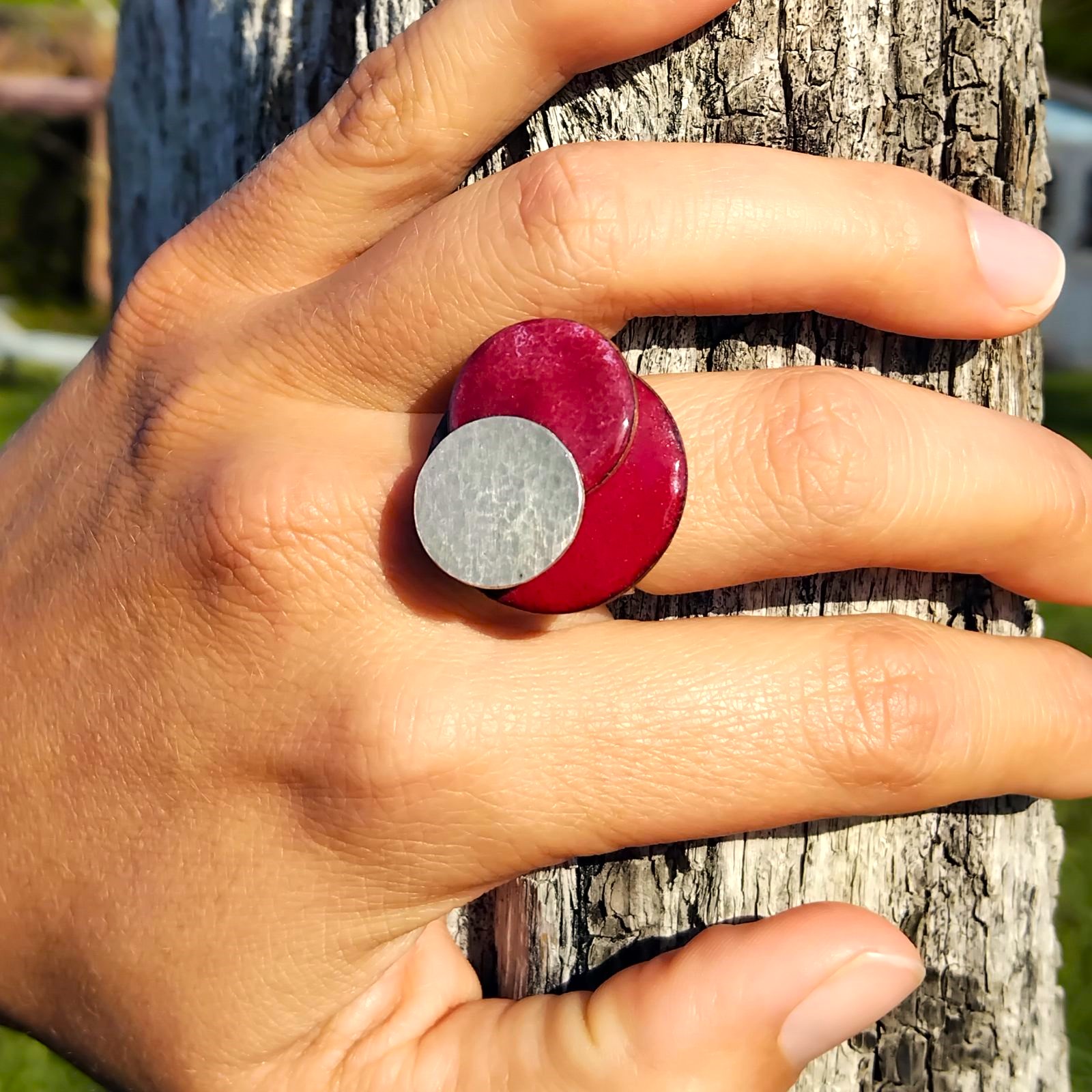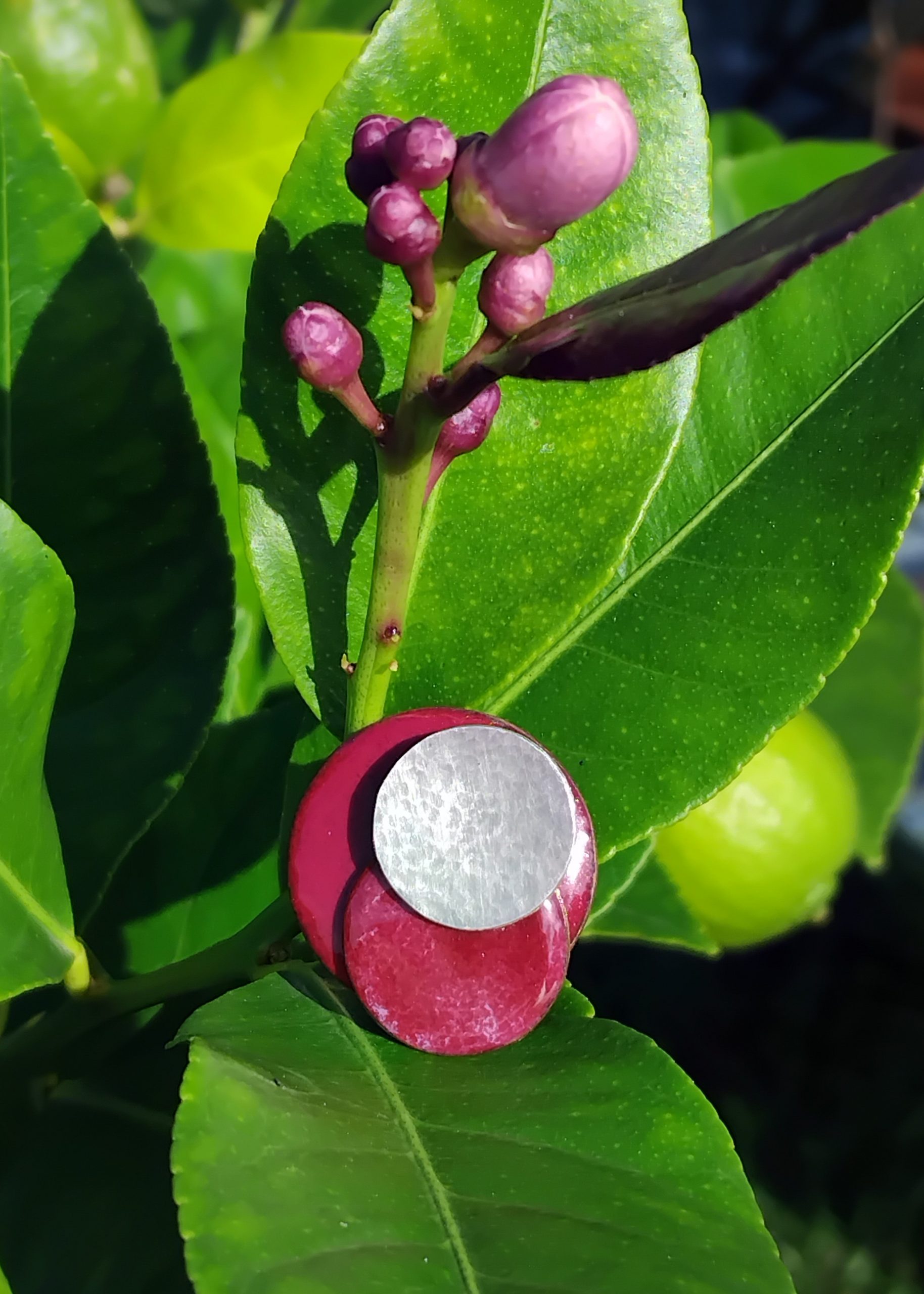 Superposition de pastilles émaillées couleur framboise et en argent martelé.