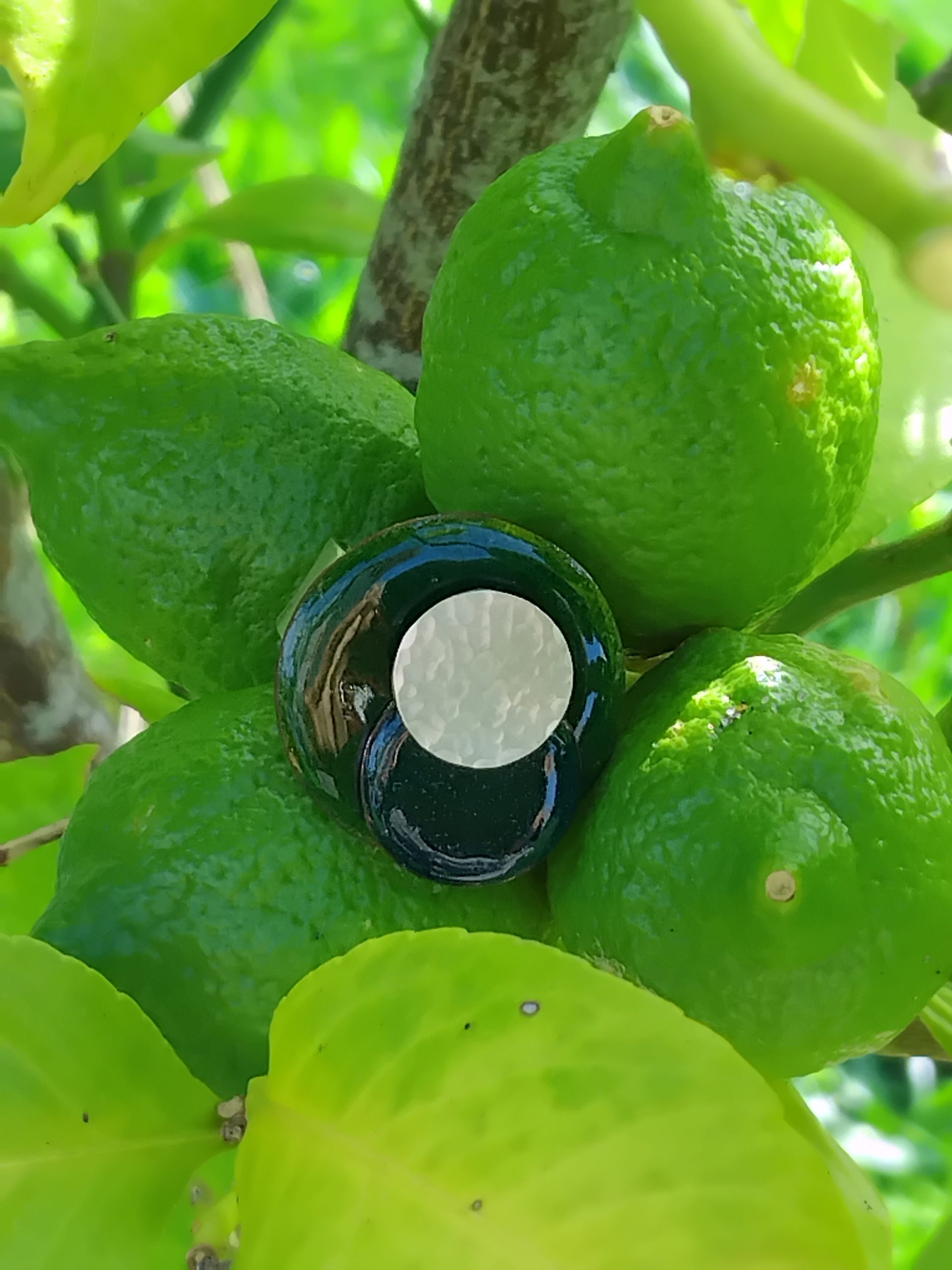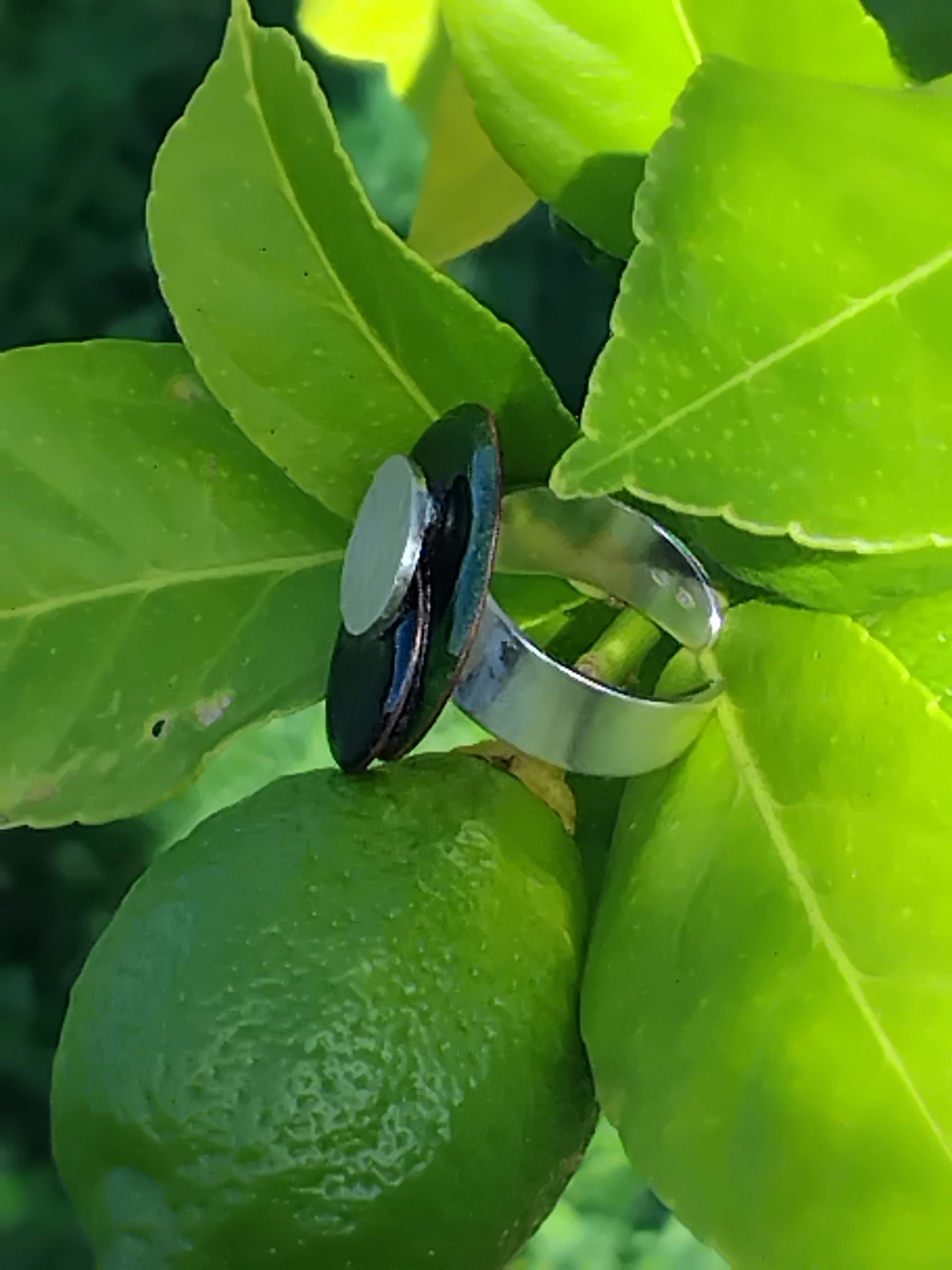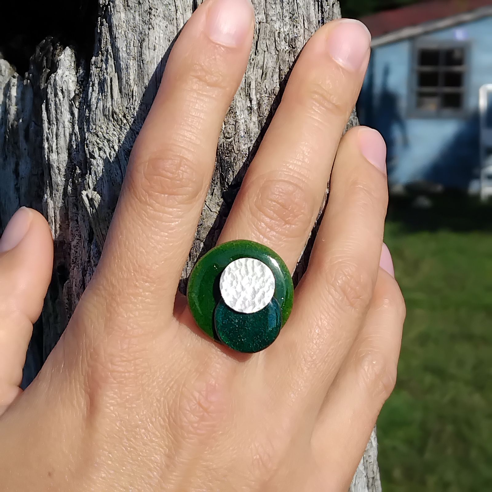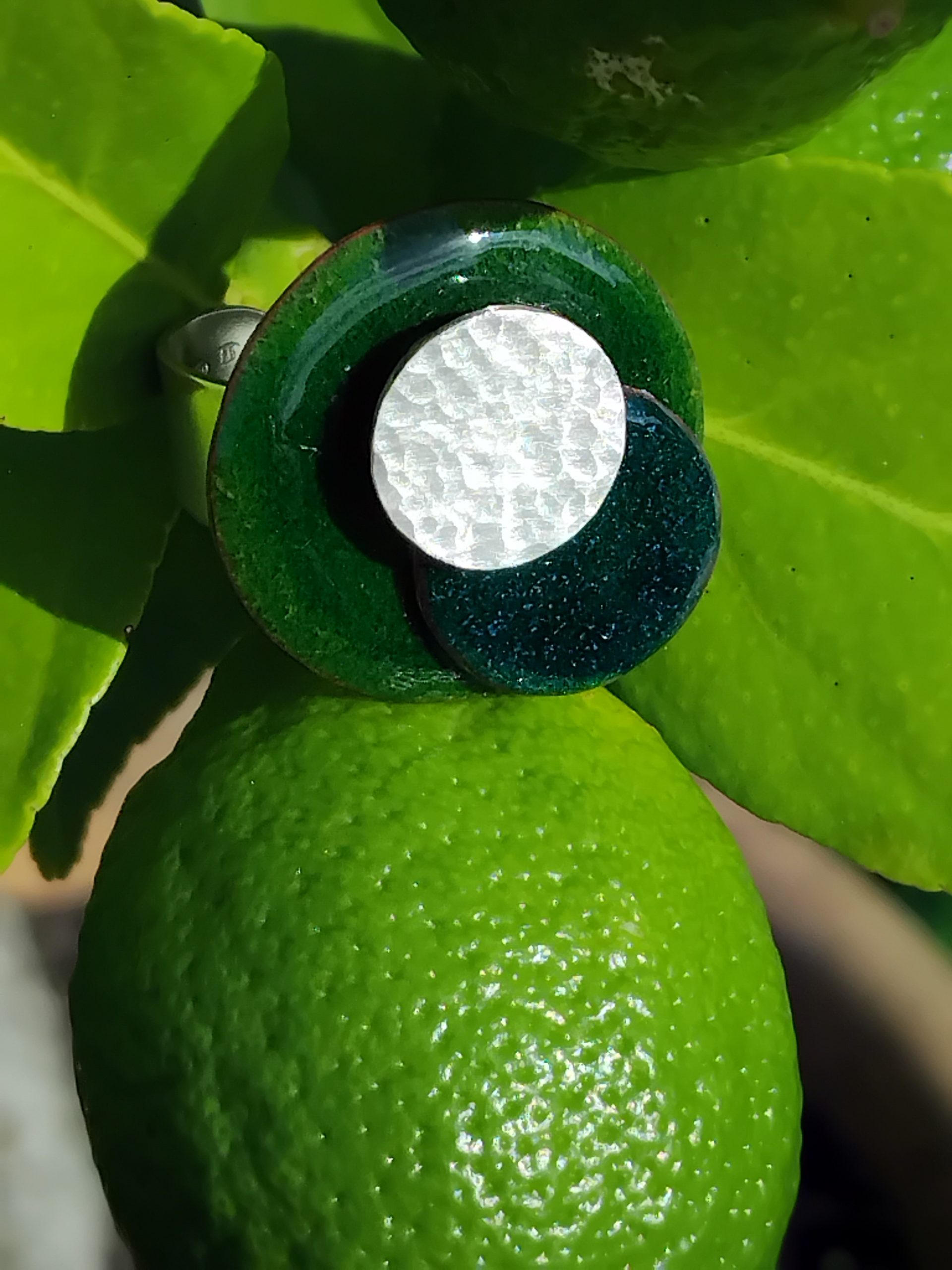 Formée de 2 pastilles émaillées et d’une autre en argent martelé. Bague réglable en argent