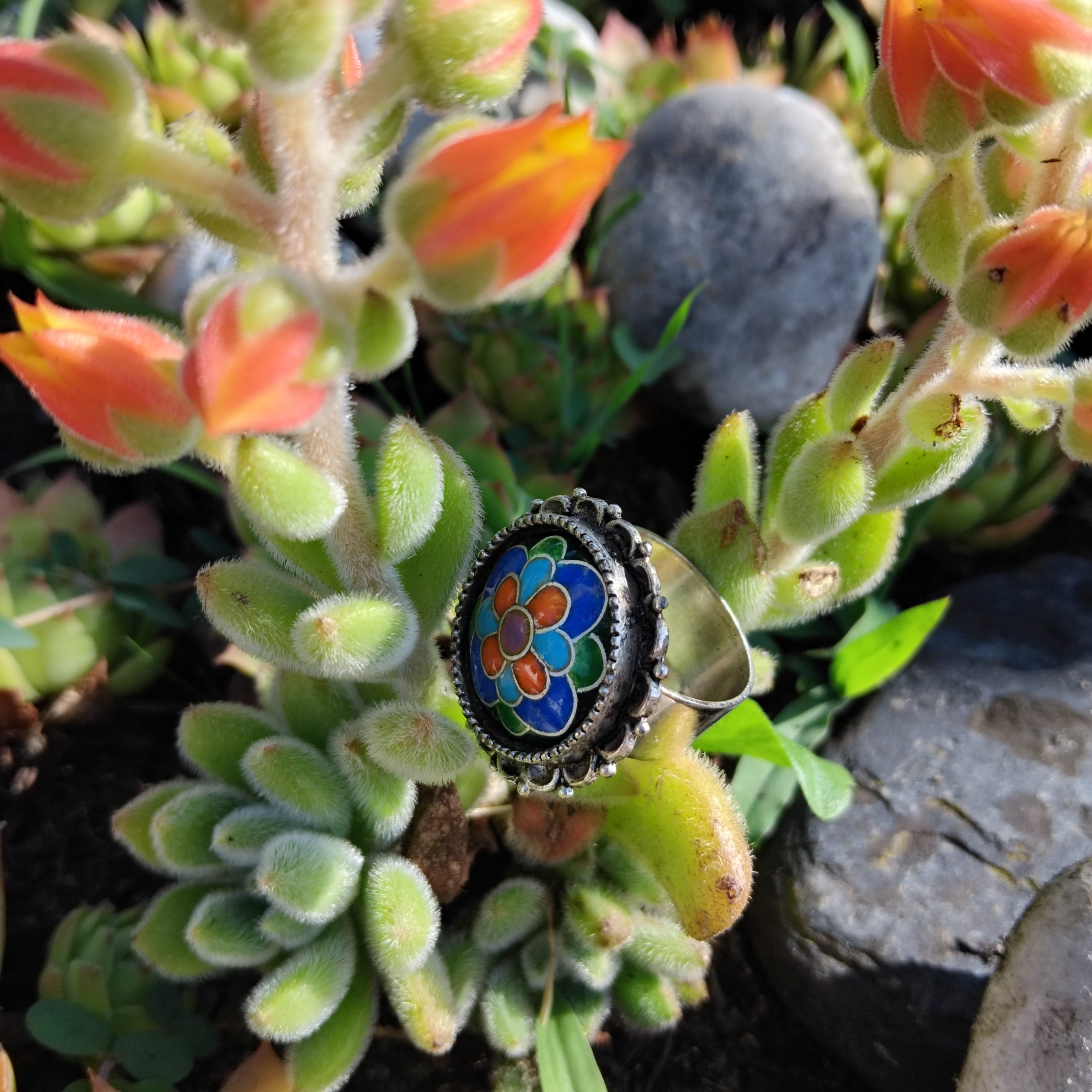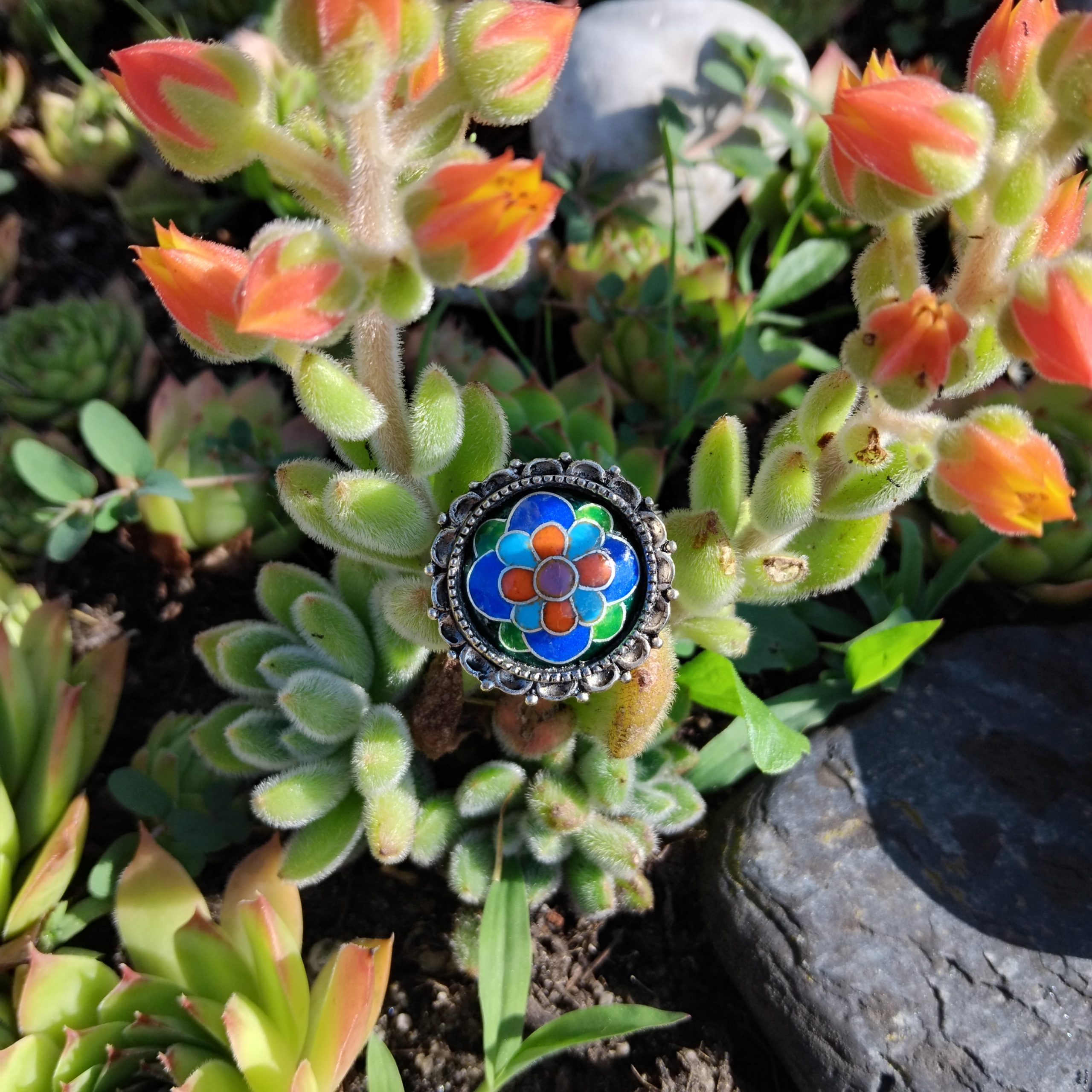 Cabochon avec fleur printanière cloisonnée en fil d’argent.