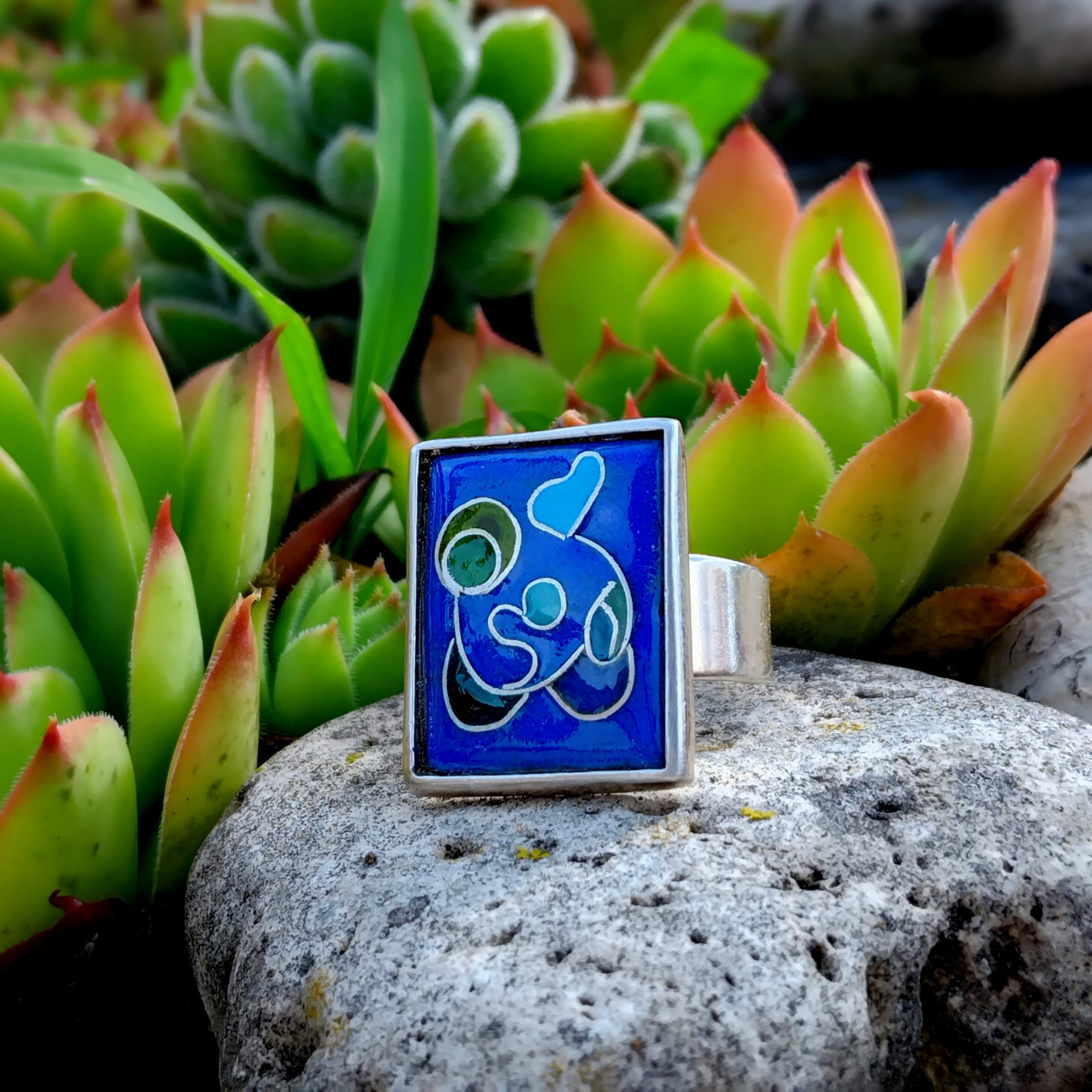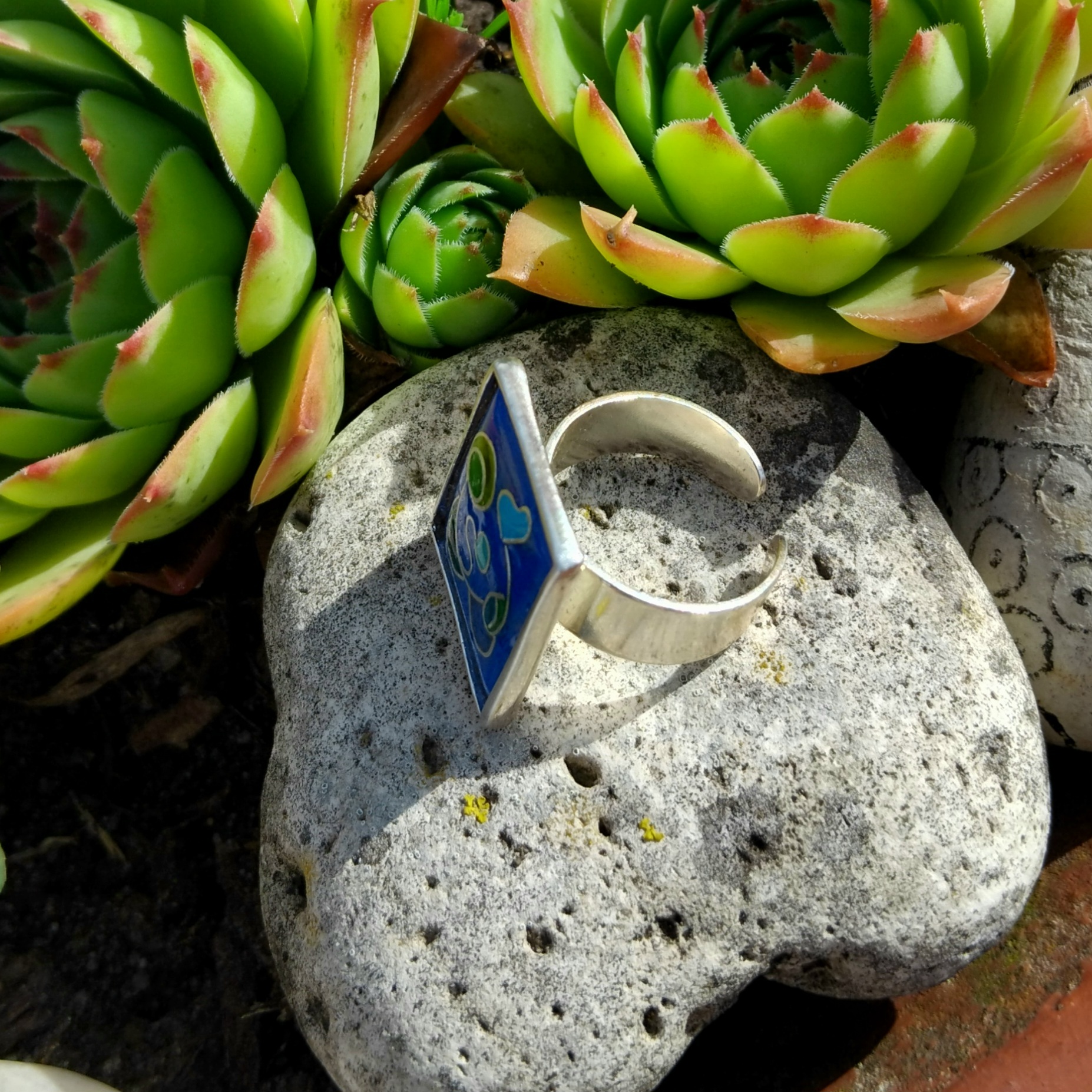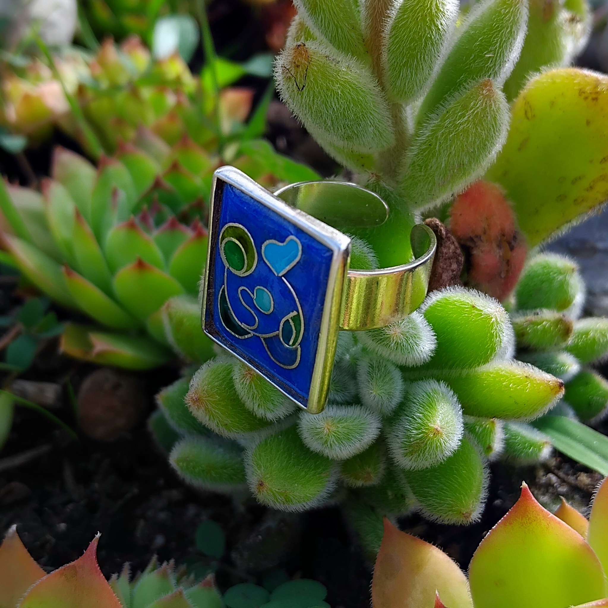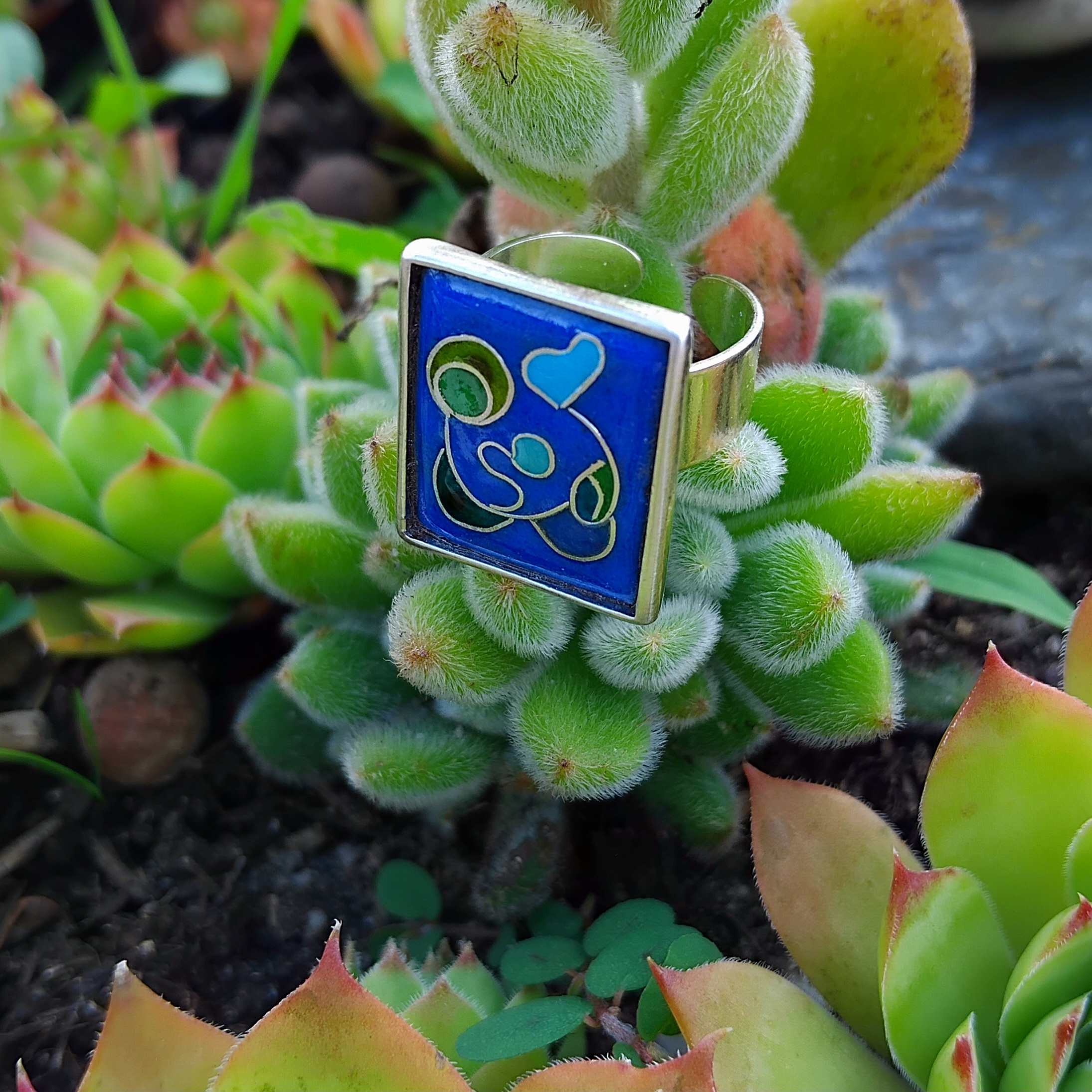Avec ses motifs cloisonnés en fil d’argent et ses camaïeux bleu et vert, cette bague donnera de la couleur à vos étés.