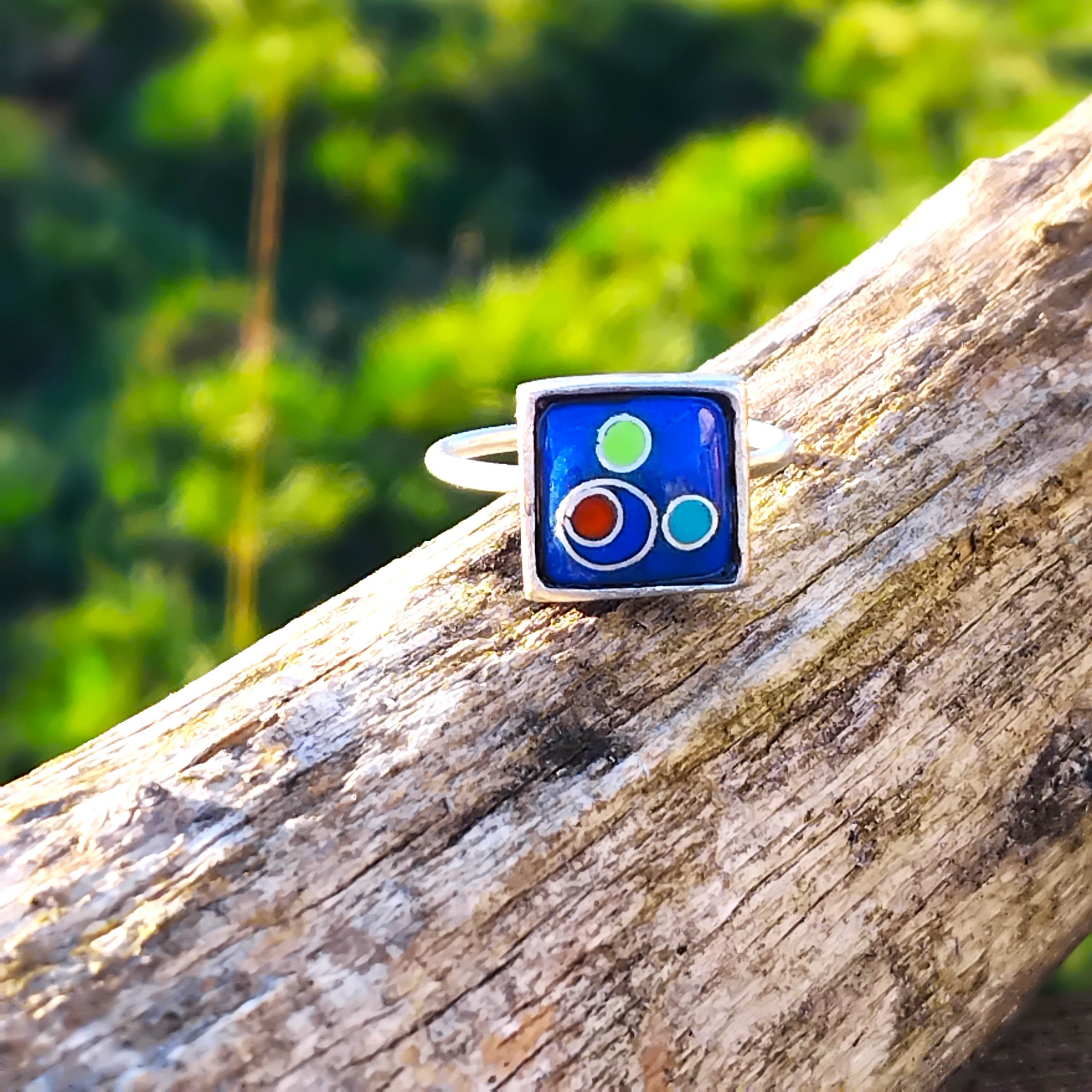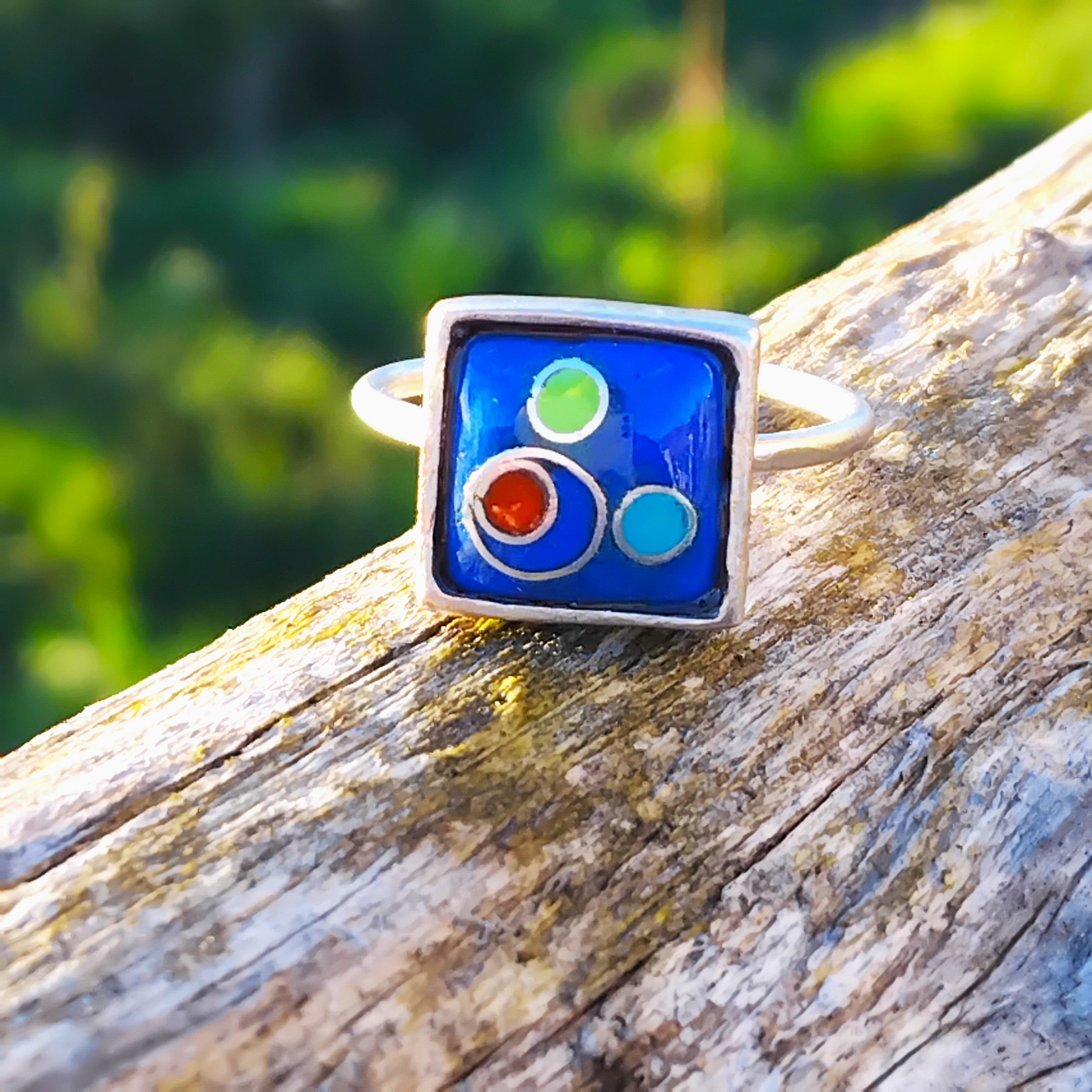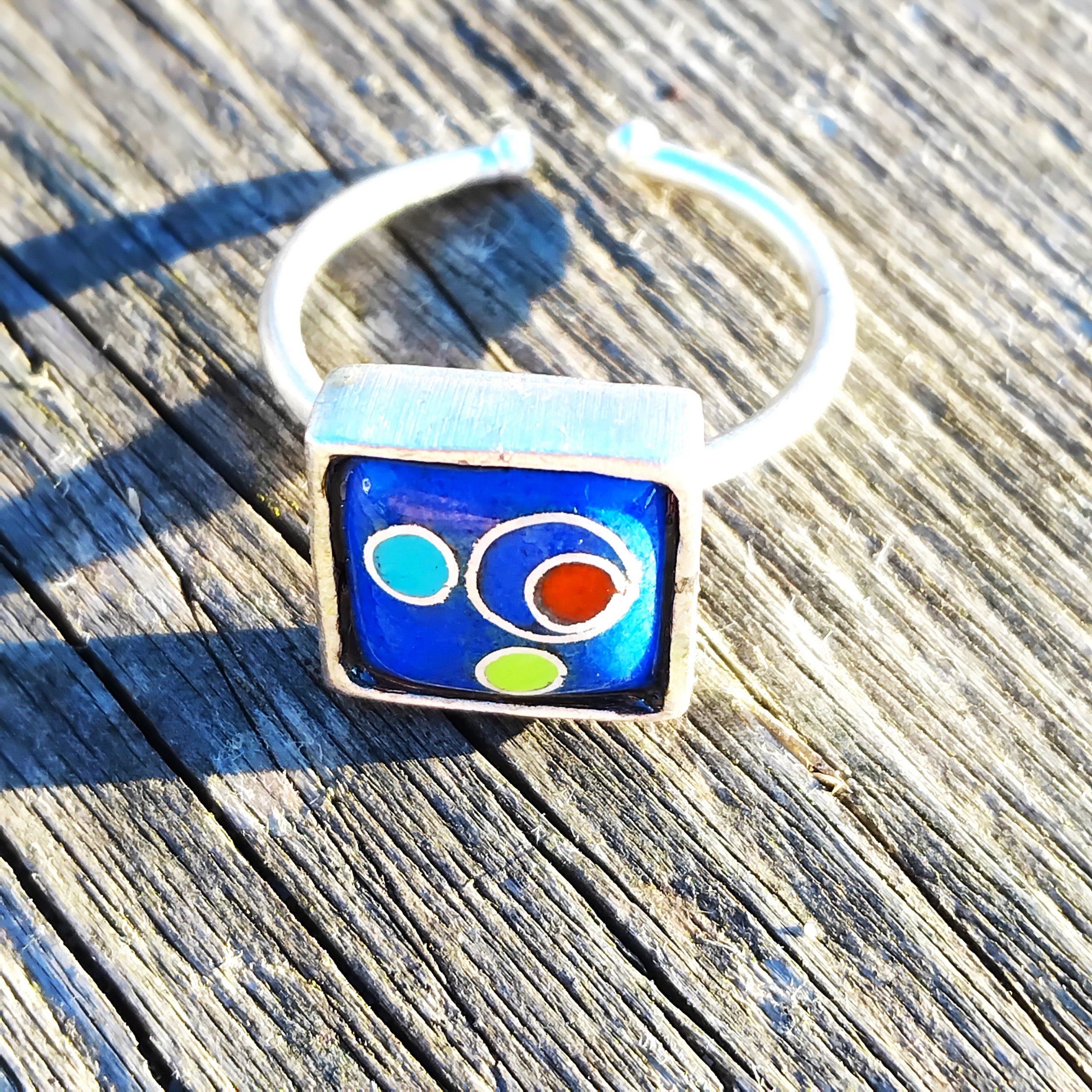 Bague carrée cabochon bleu outremer en cloisonné fil d’argent avec de petits motifs colorés.