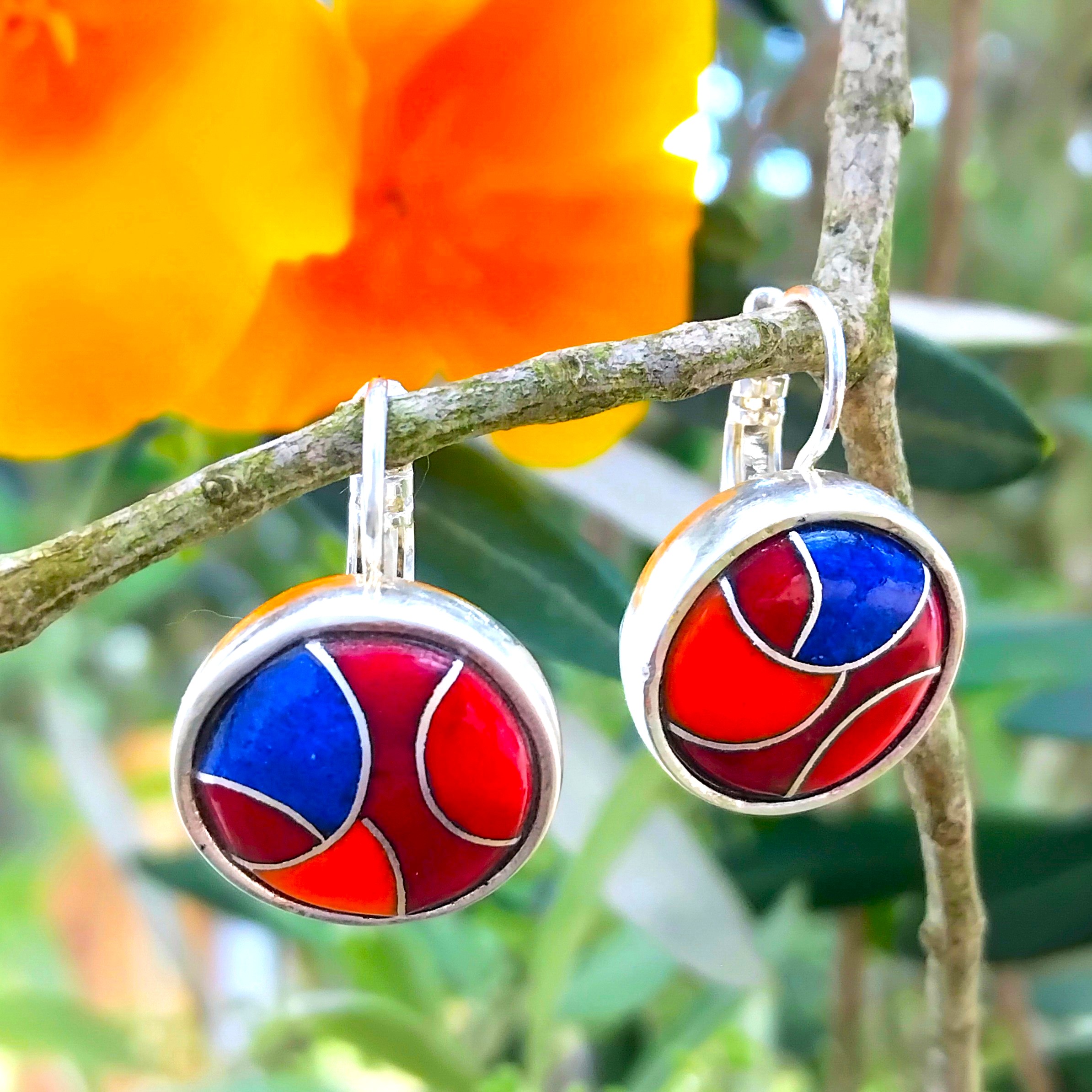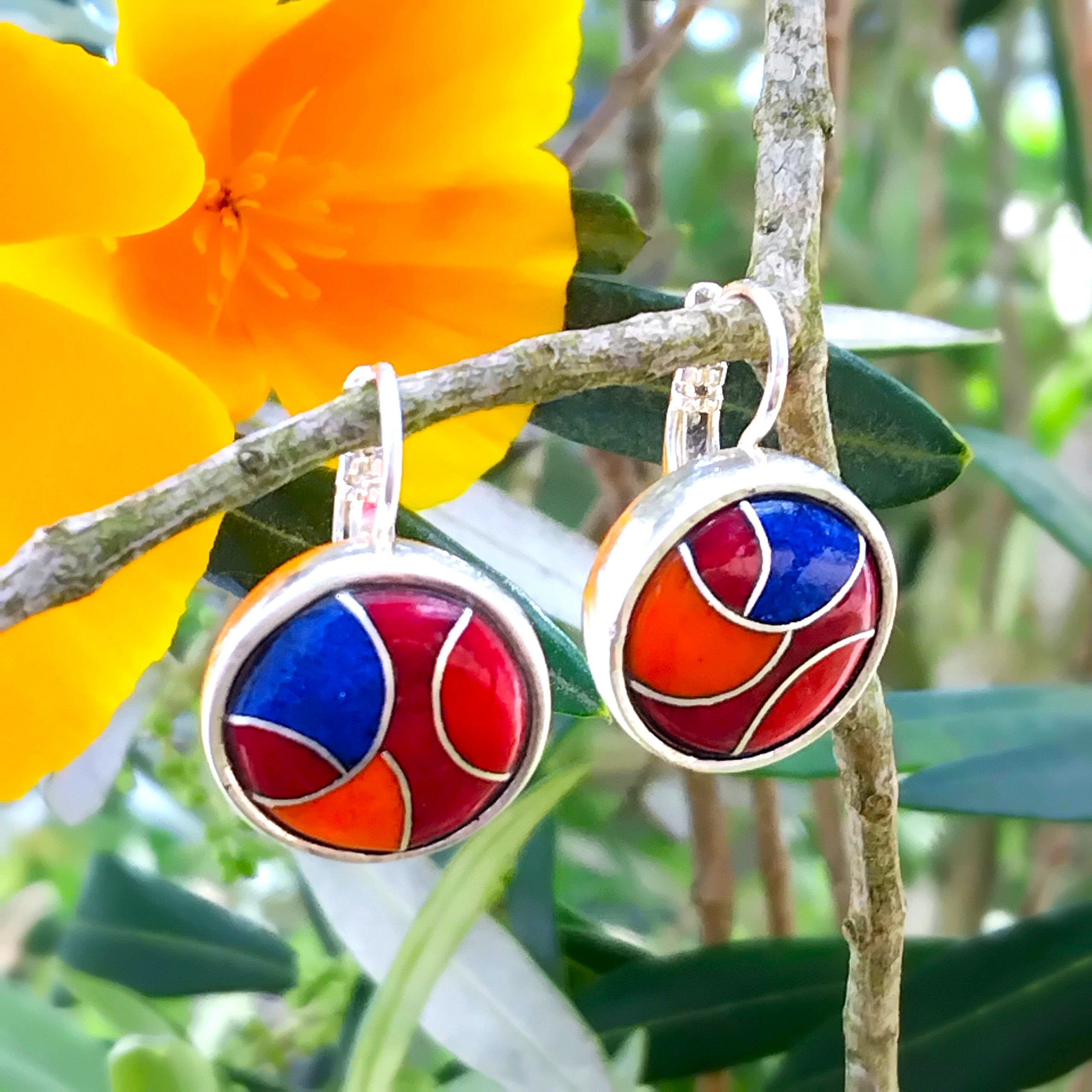 Boucles d’oreilles en émail cloisonnées avec fil d’argent, support en laiton recouvert d’argent (10 microns).