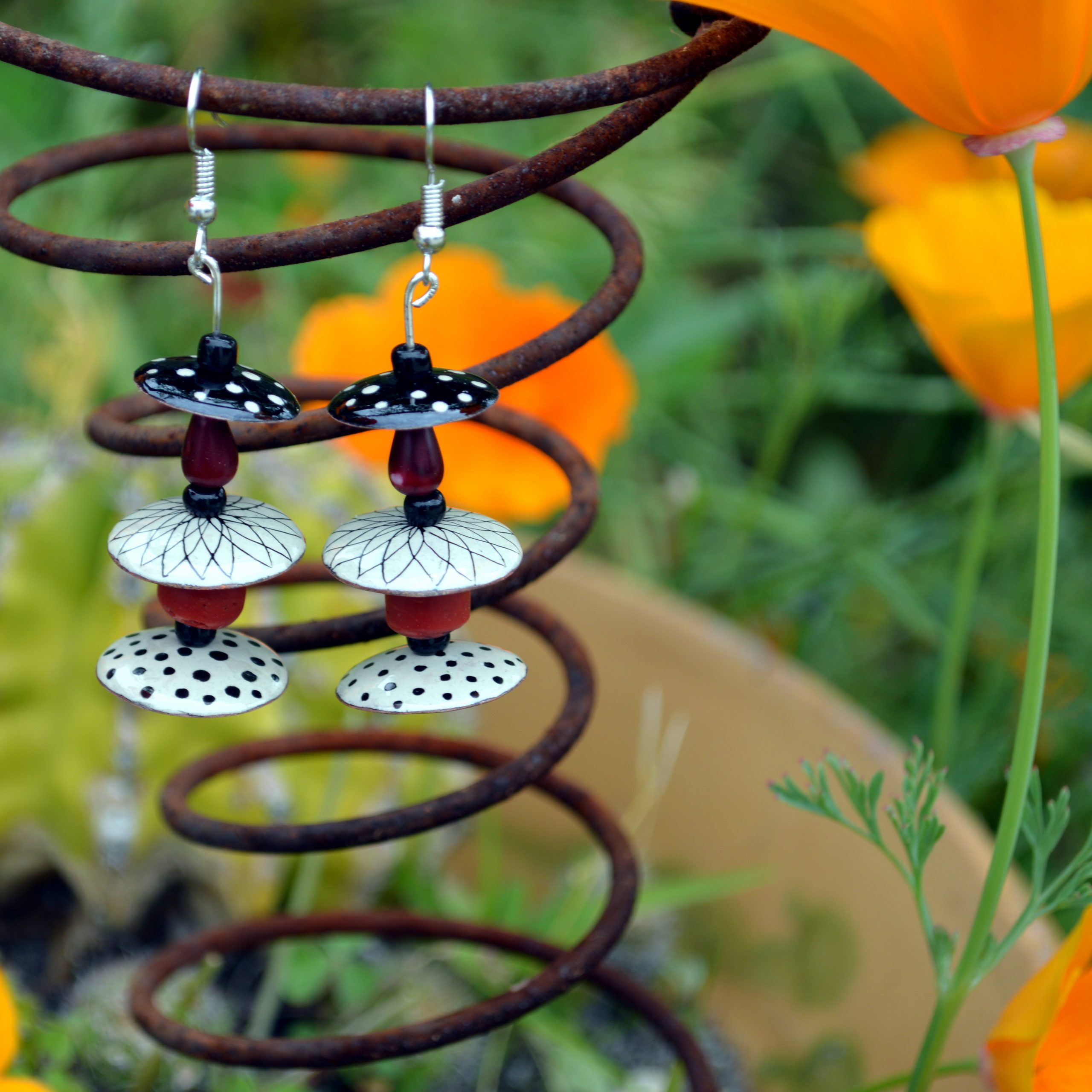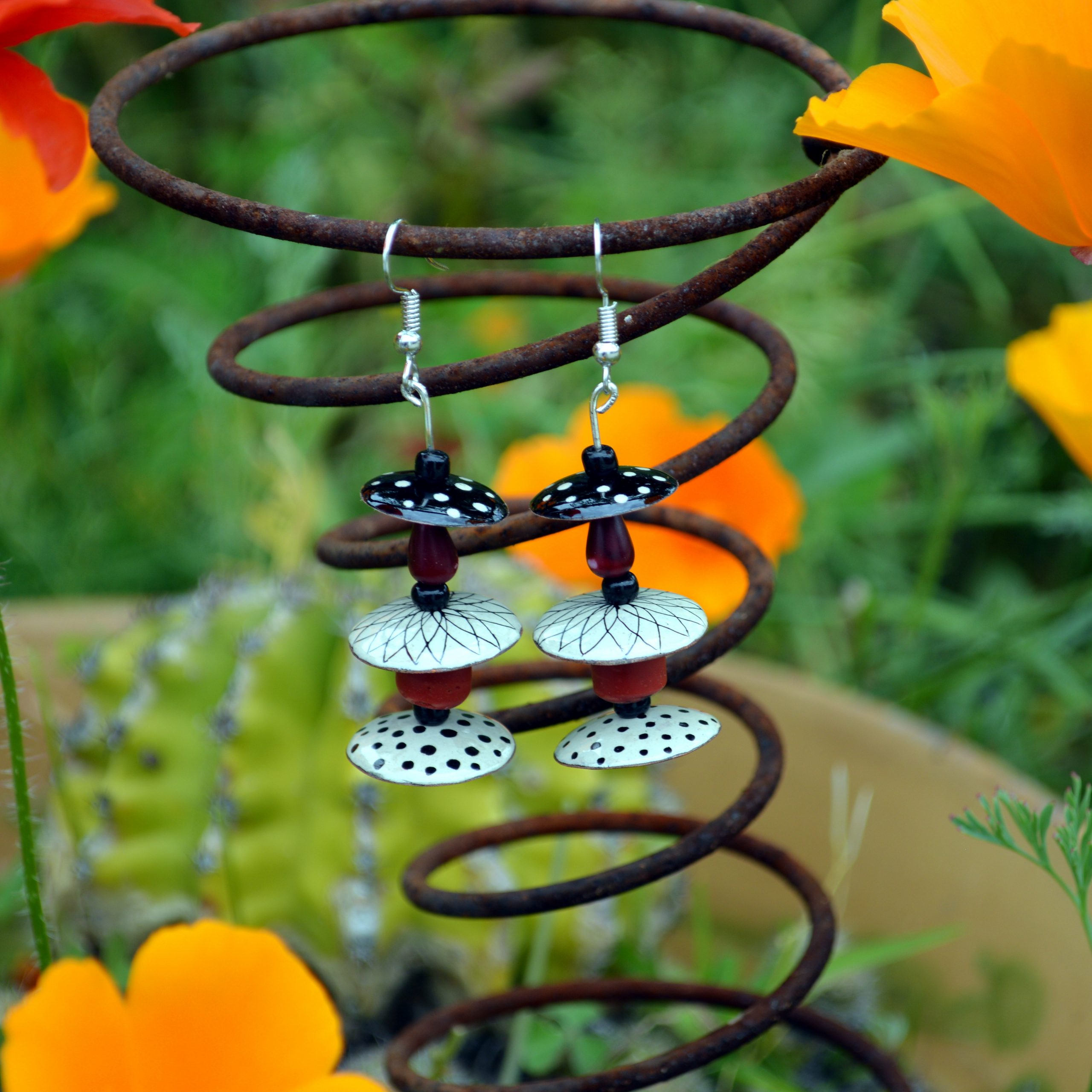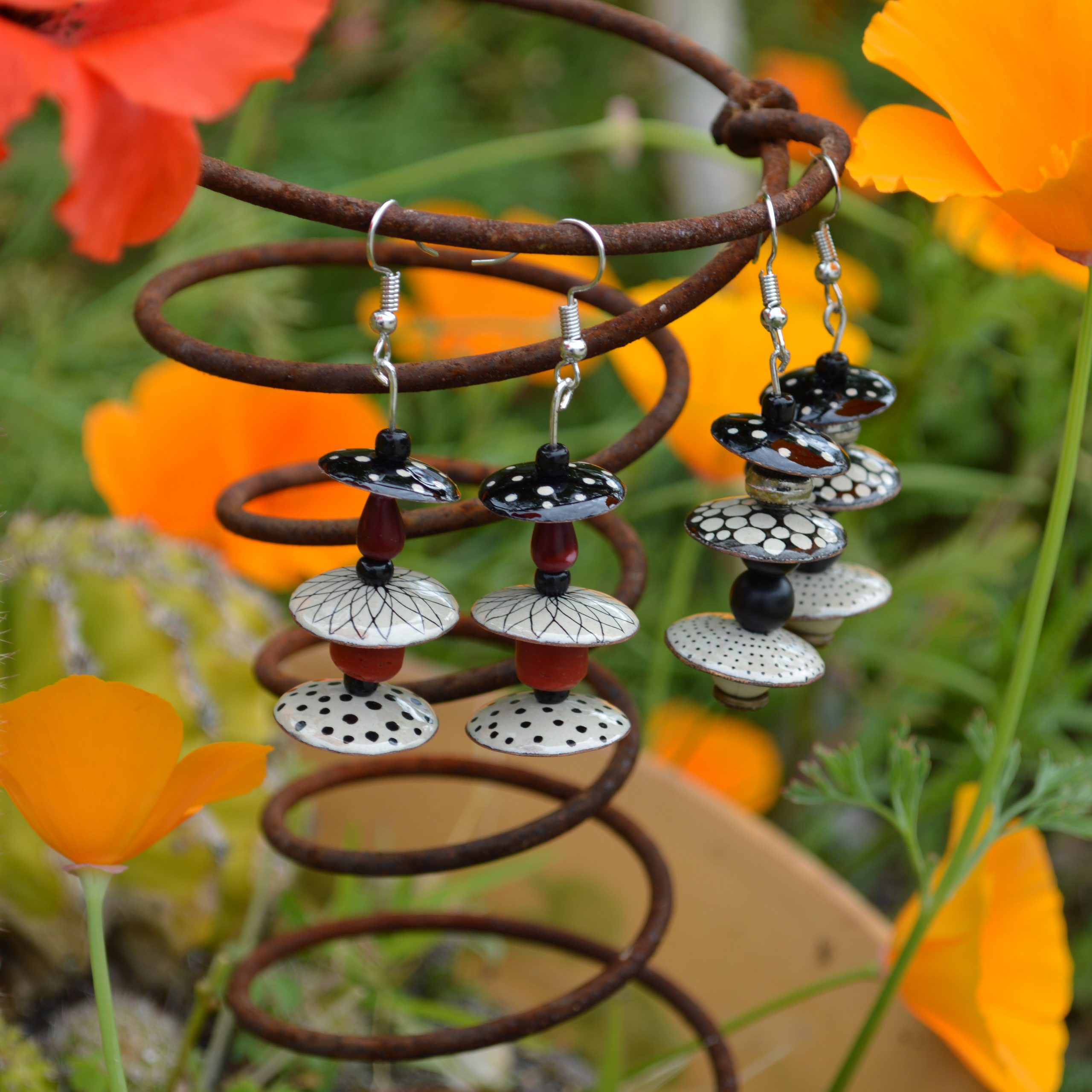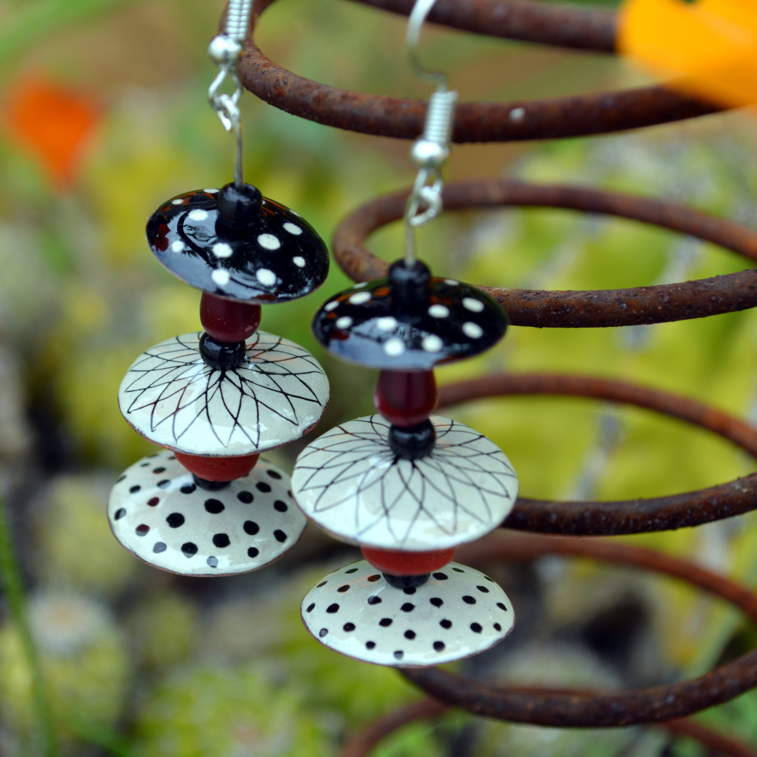 Mignon petit champignon en noir et blanc relevé par des petites perles rouge et orange entre chaque étage.