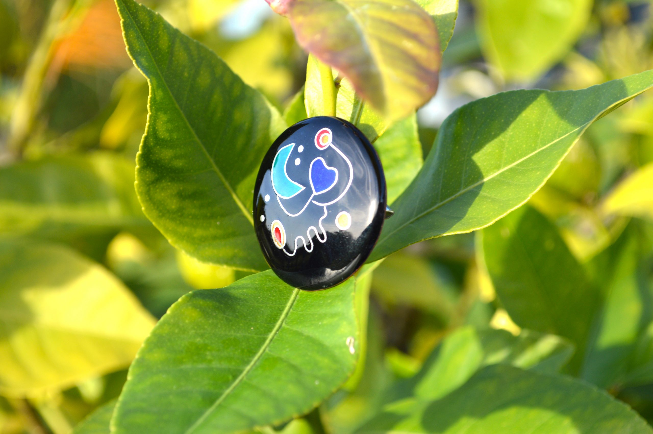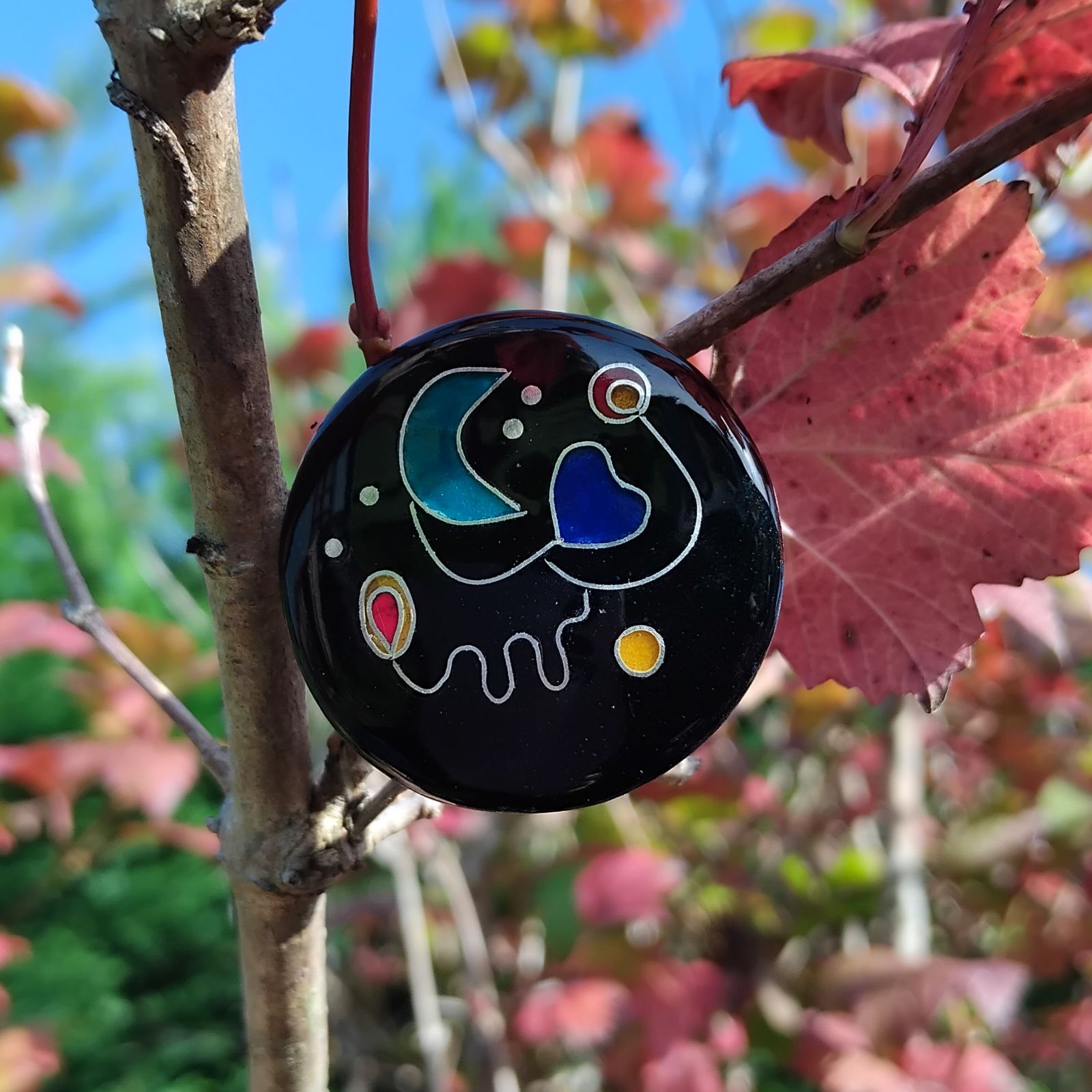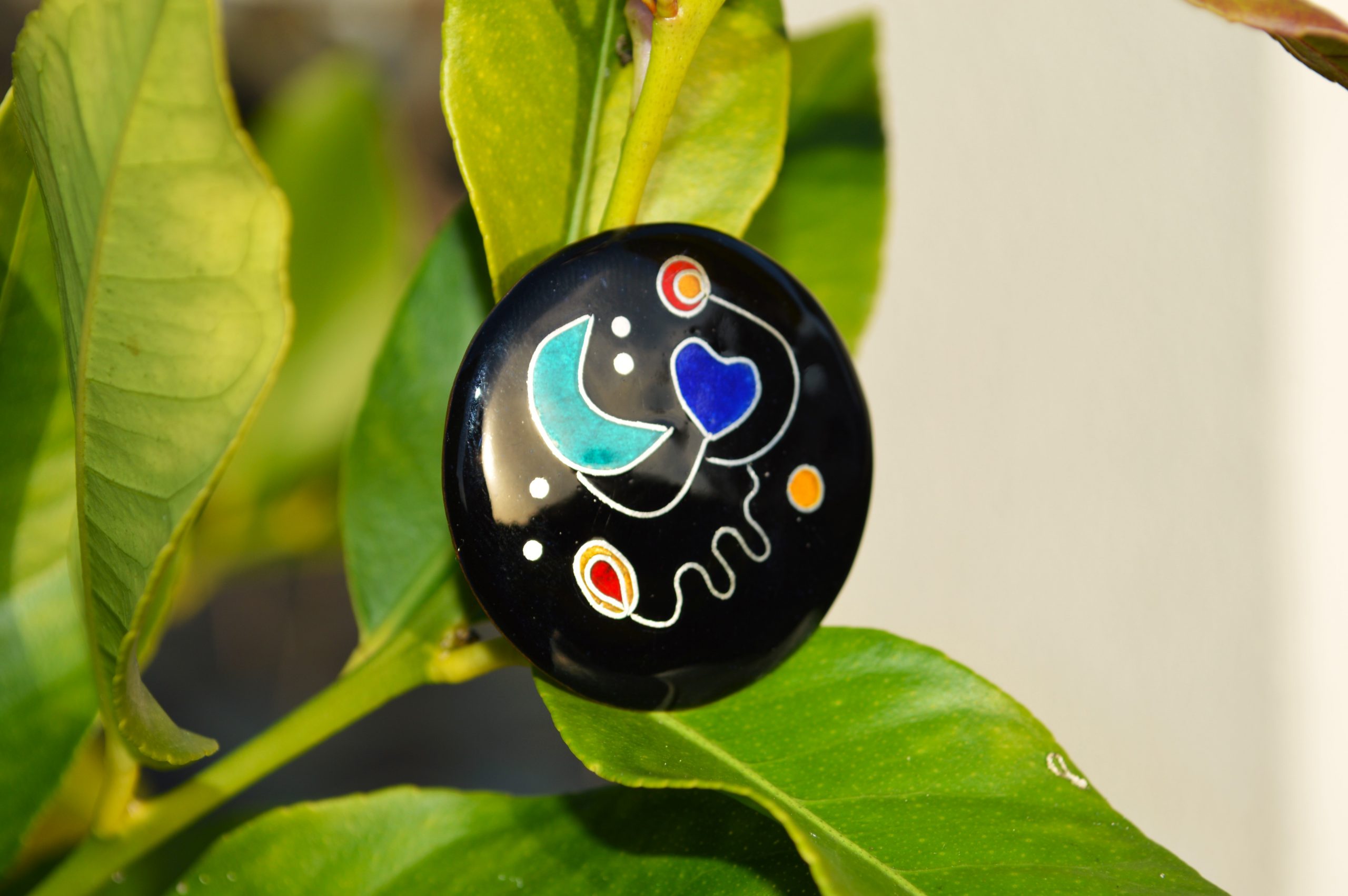 Broche en cloisonné avec fil et petites billes d’argent. Ses couleurs sont élégantes.