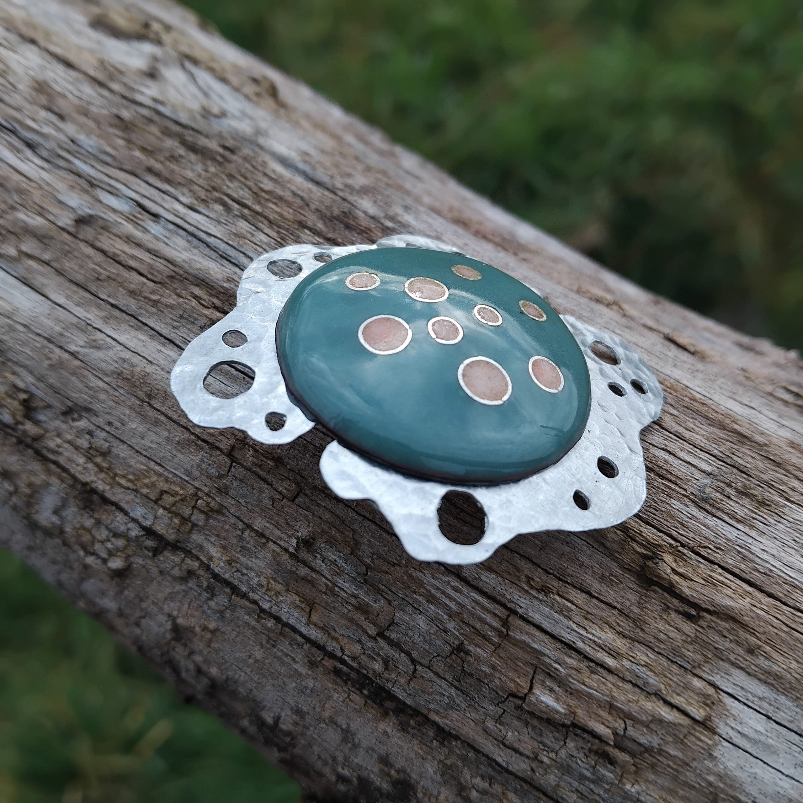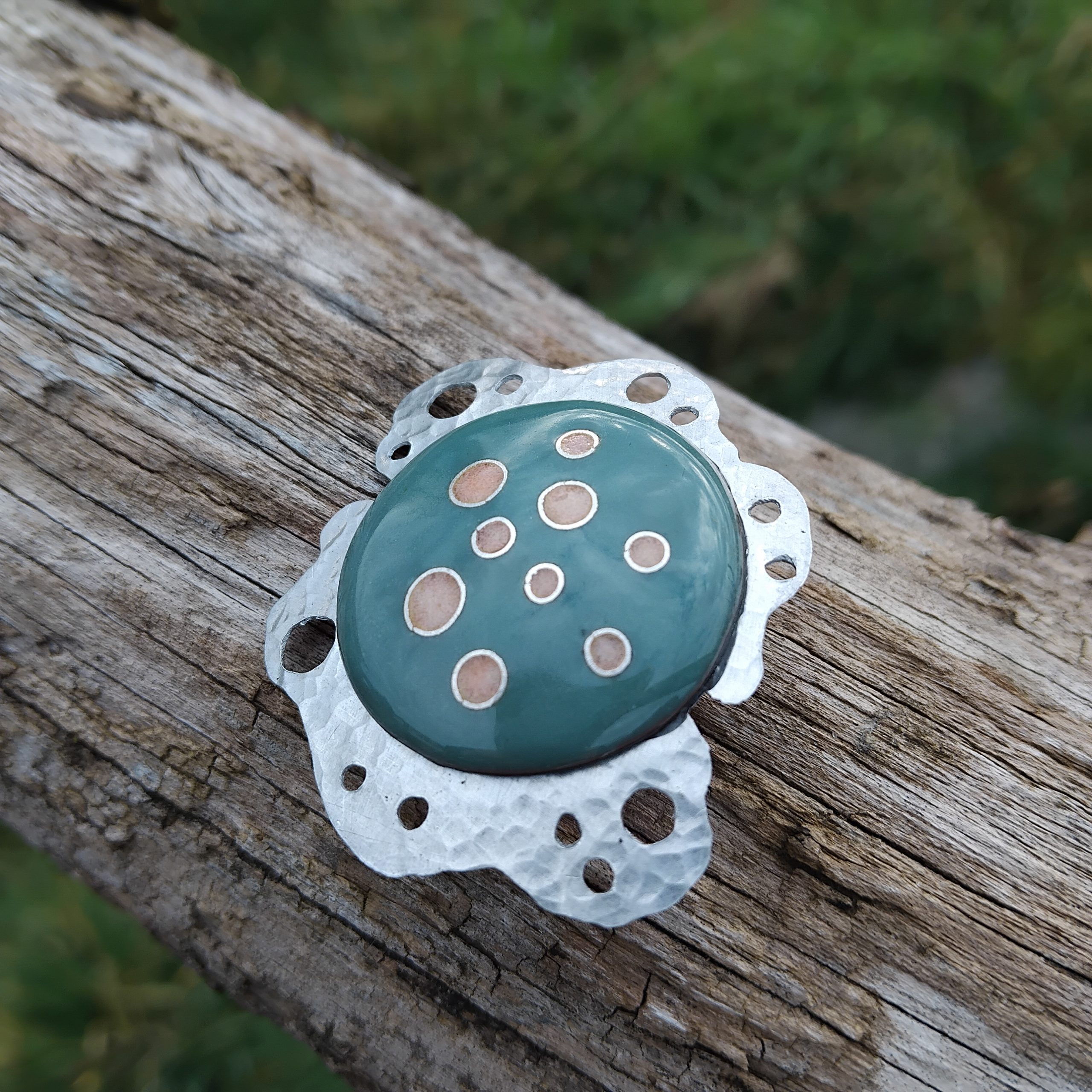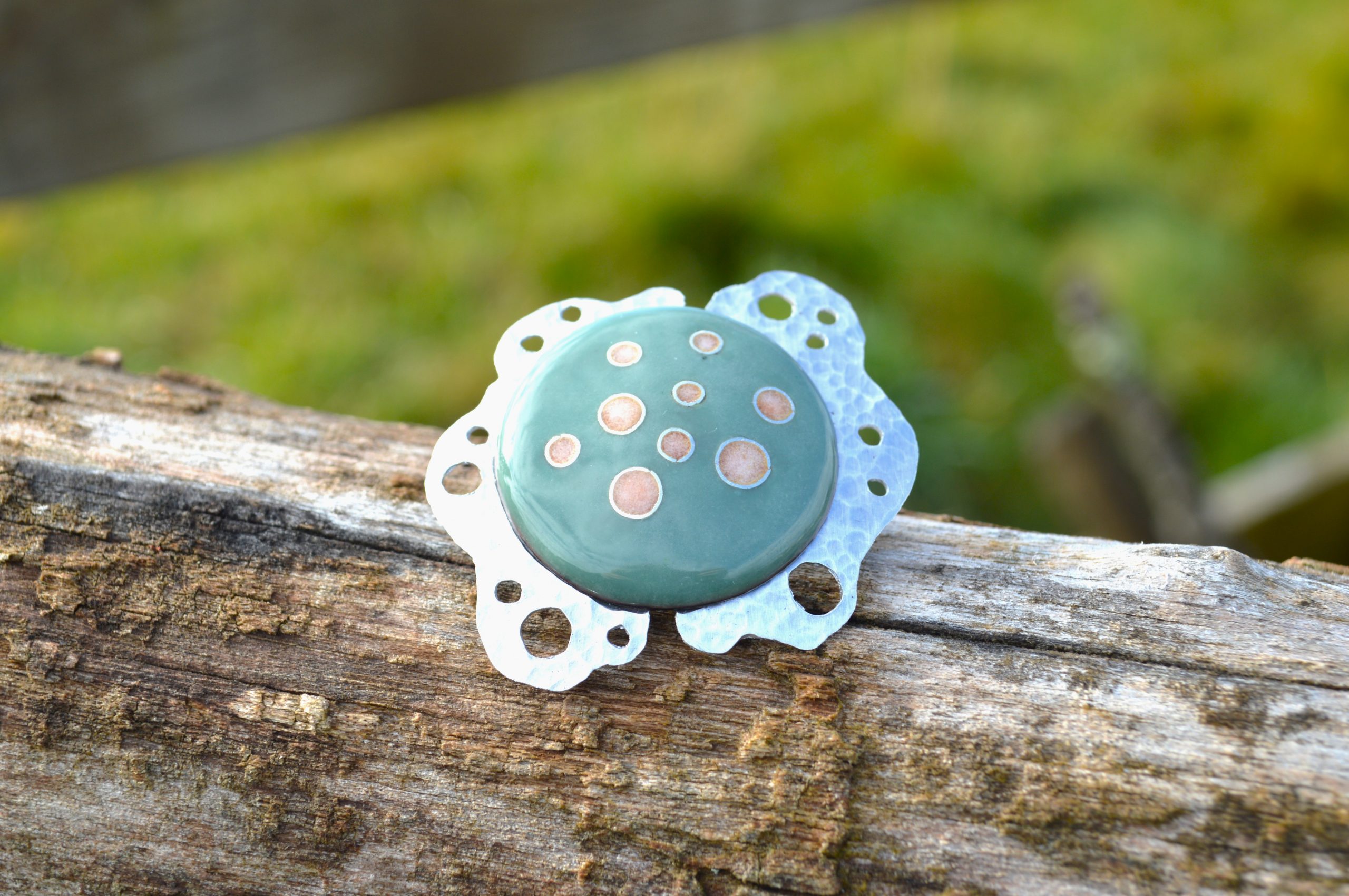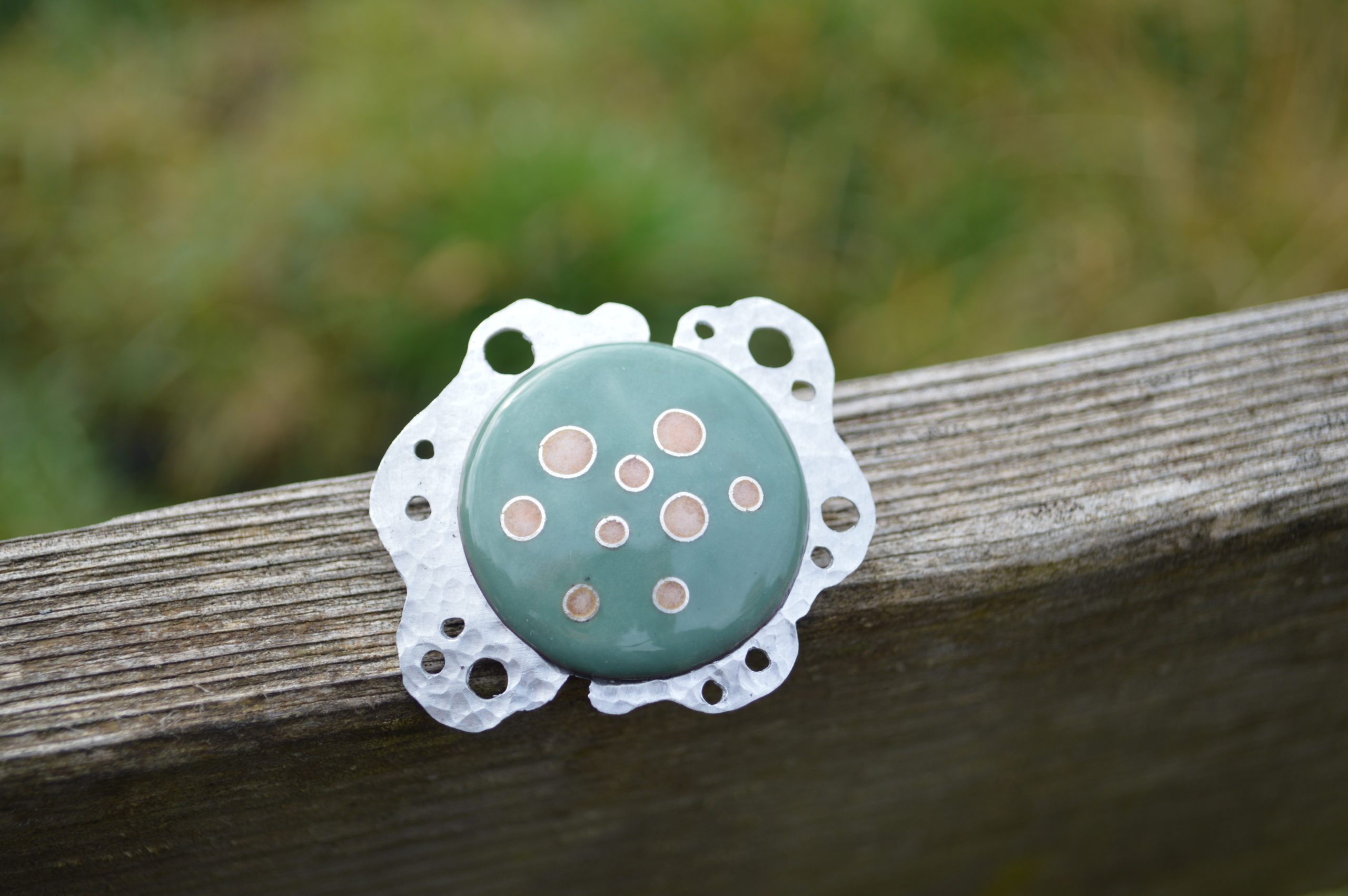 Broche émaillée d’un disque vert avec des nuances de gris, de petits ronds rose cloisonnés en fil d’argent.