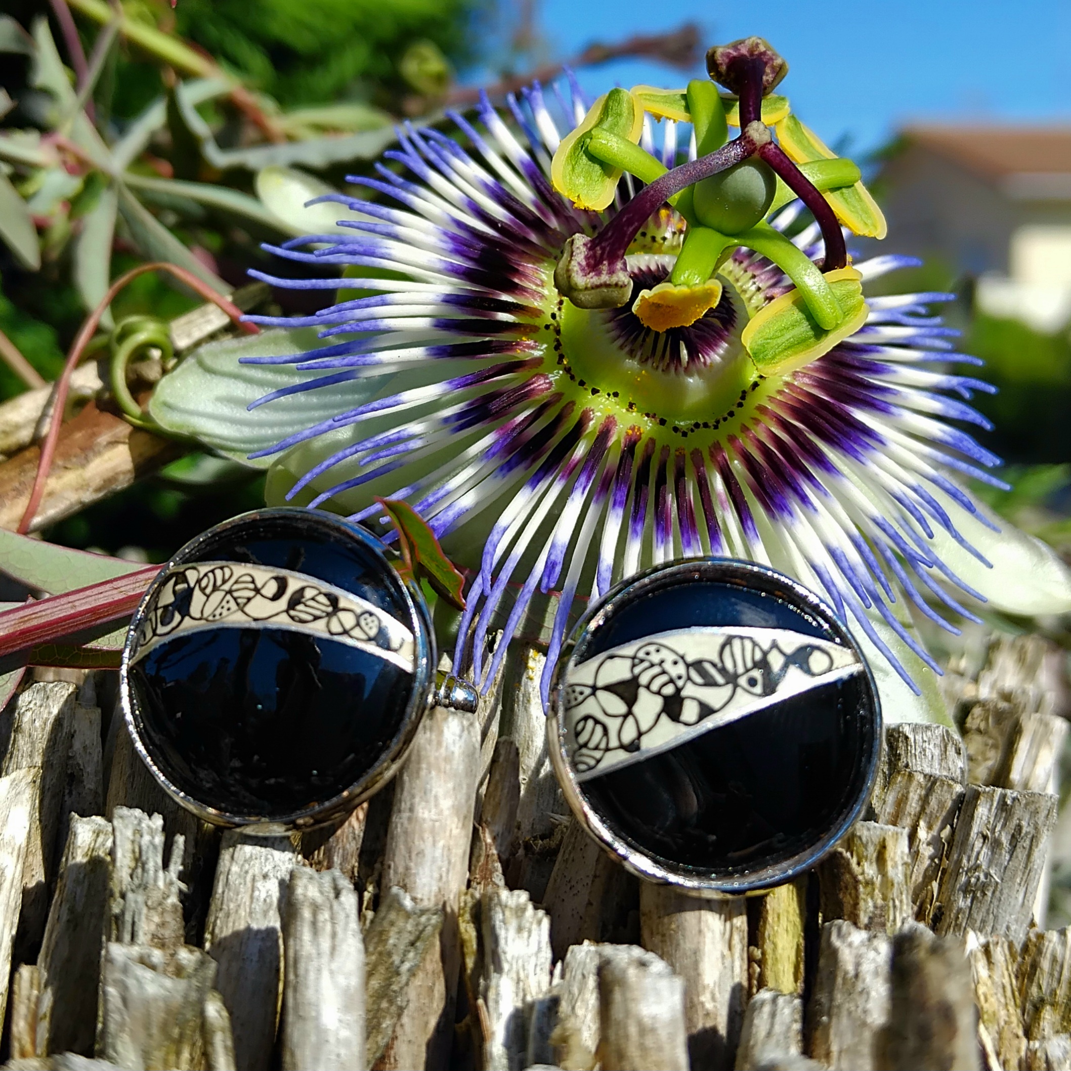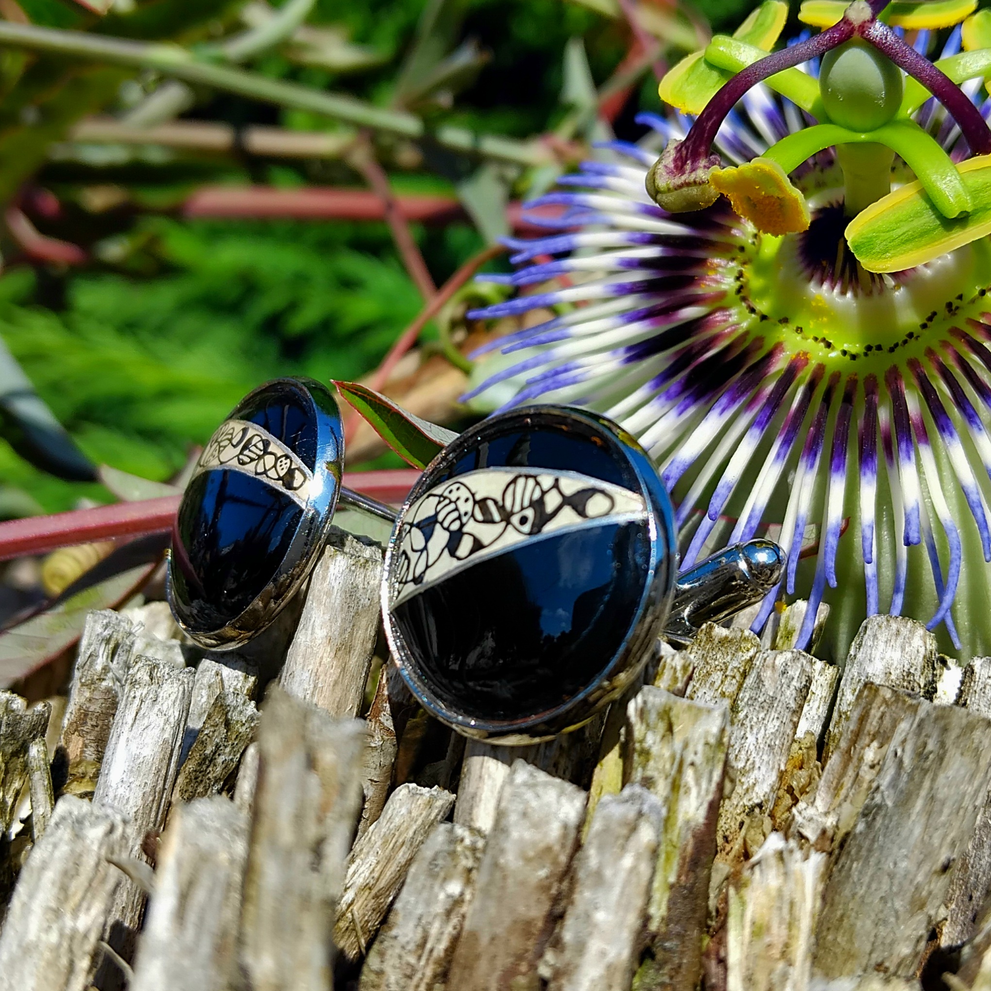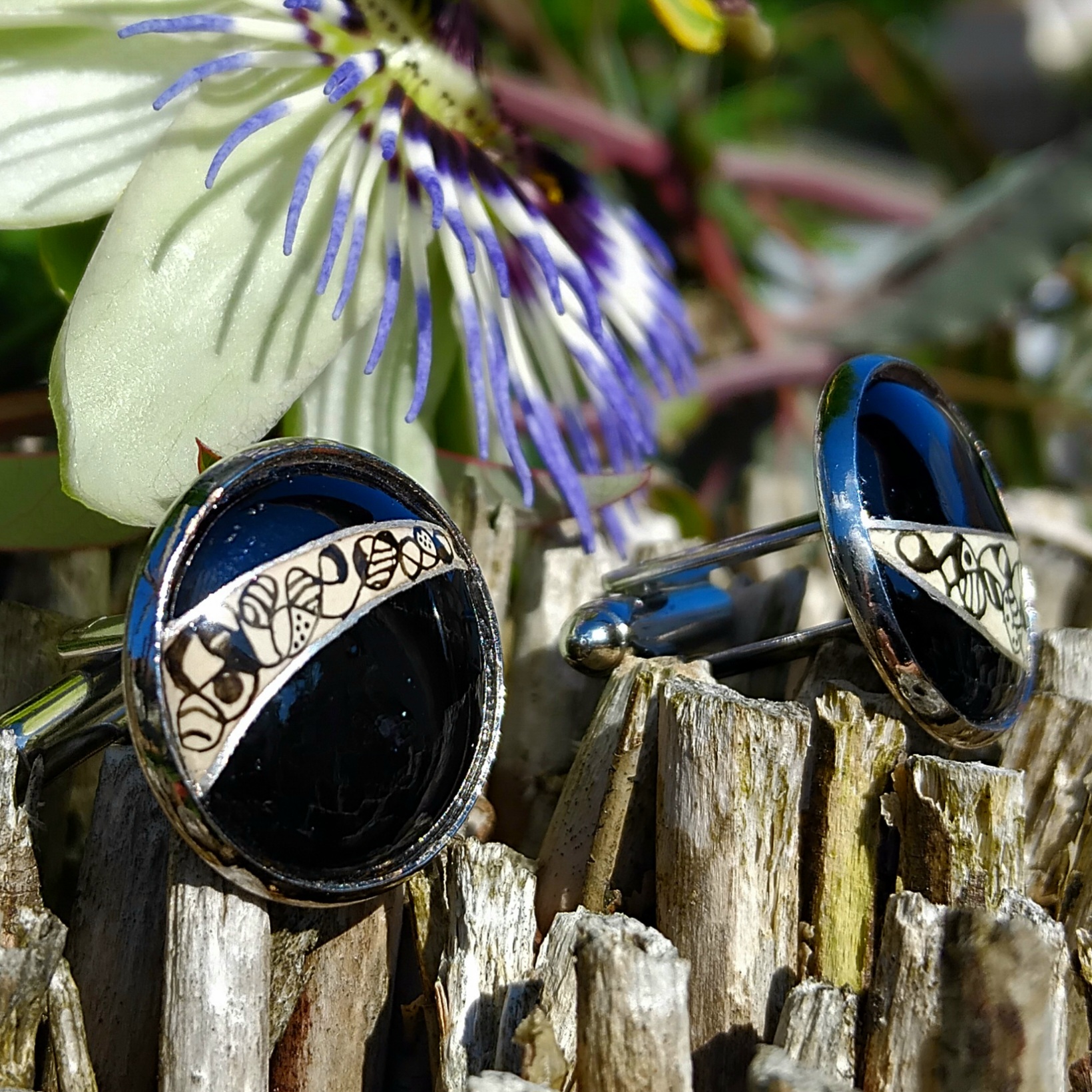Boutons de manchette noirs et beiges, motifs entre deux fils d’argent tracés à la plume.