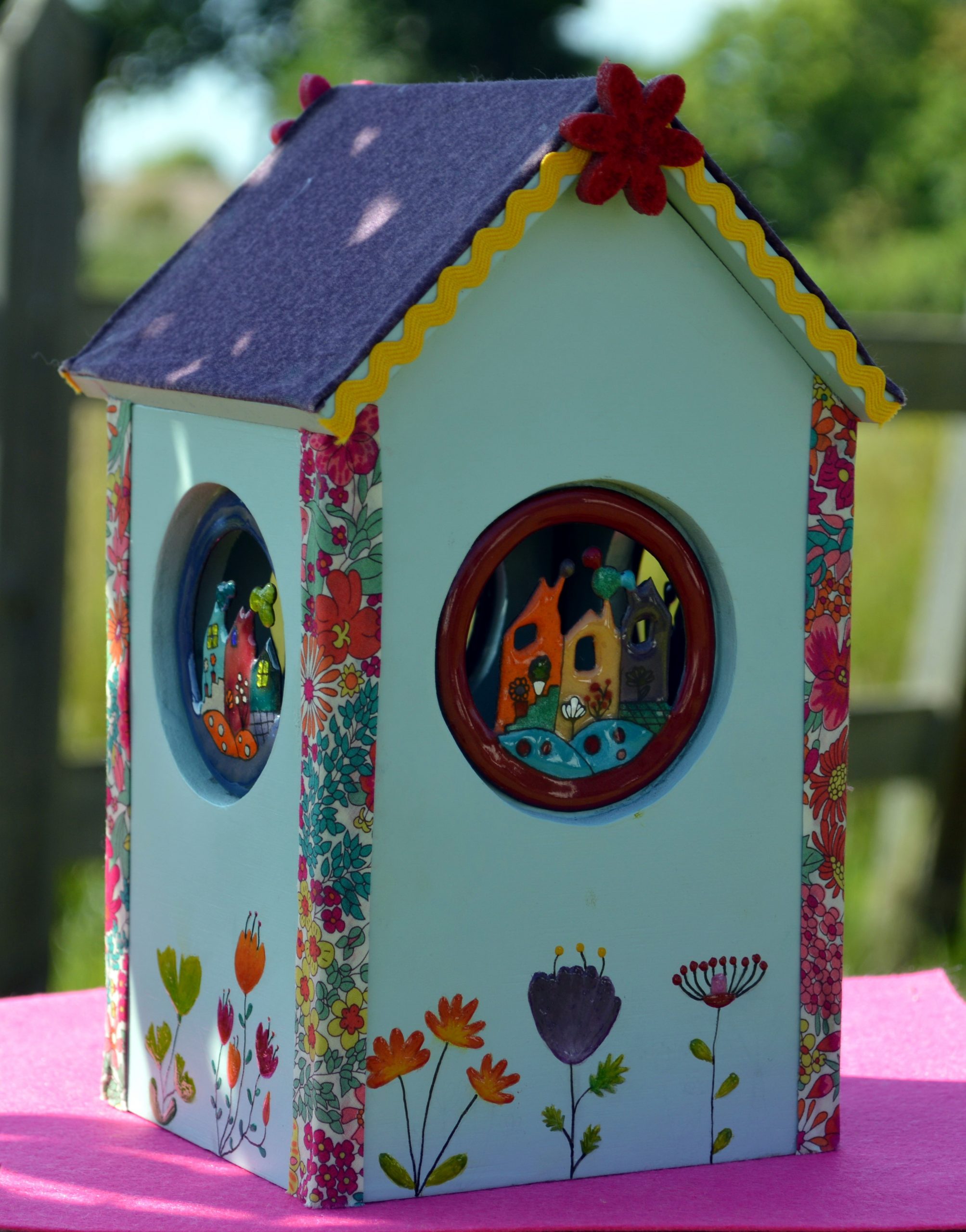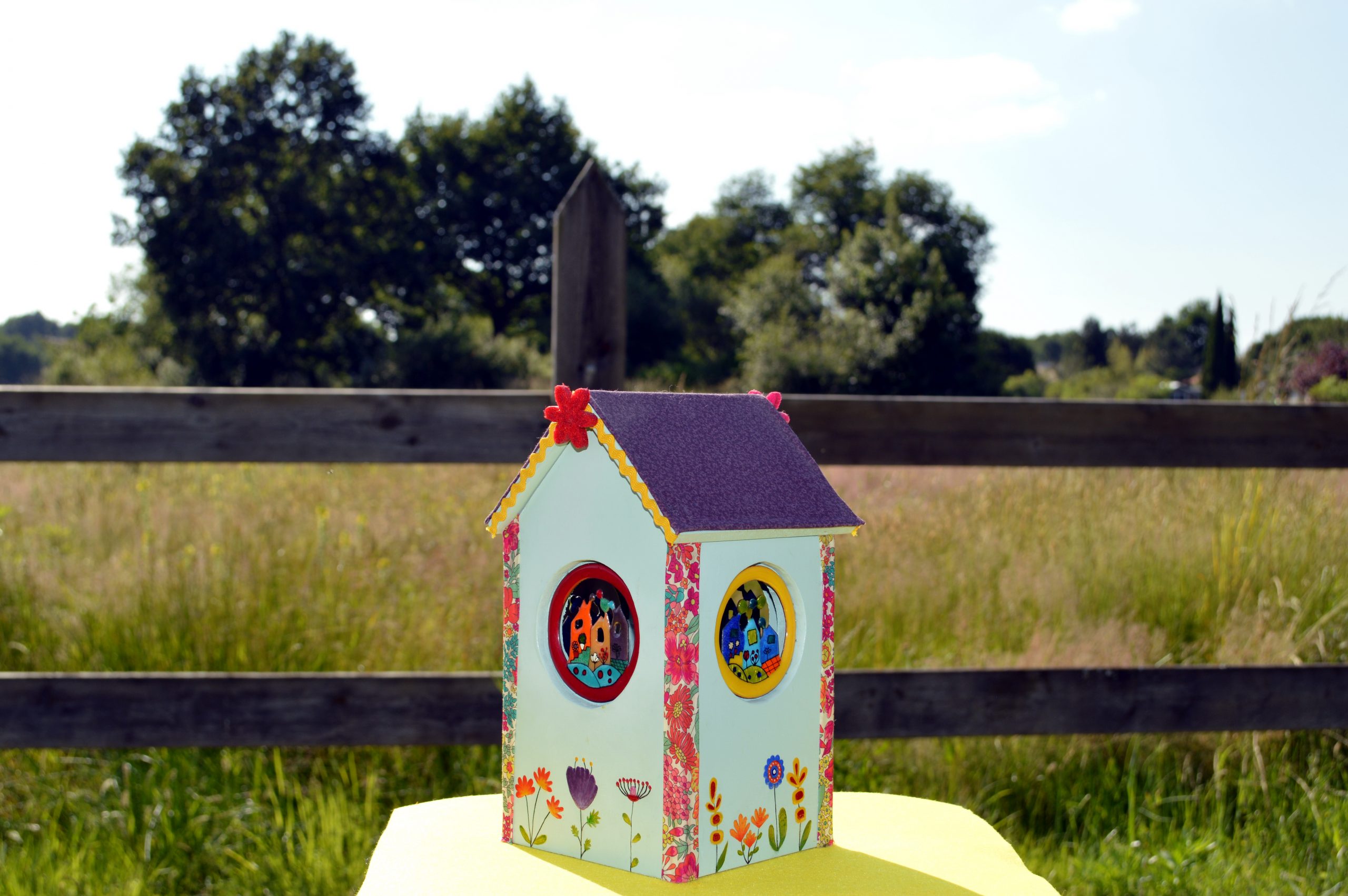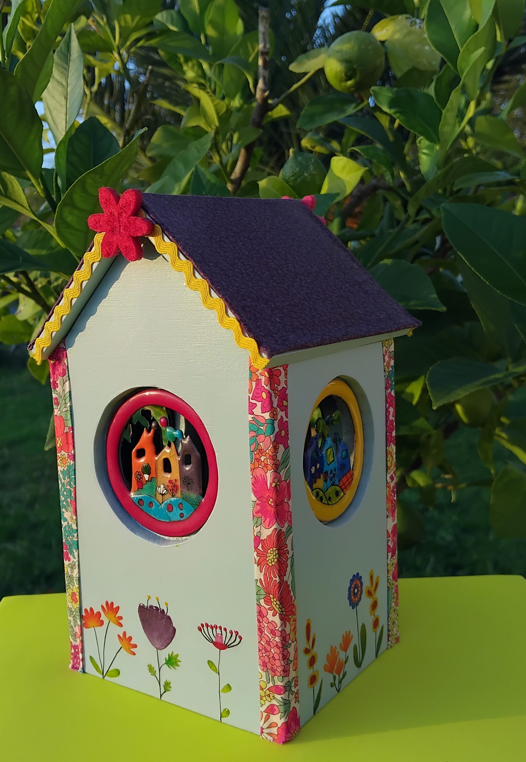 Cette petite maisonnette en bois peint, tissus, avec 4 jolies fenêtres ajourées émaillées plaira aux grands comme aux petits.
