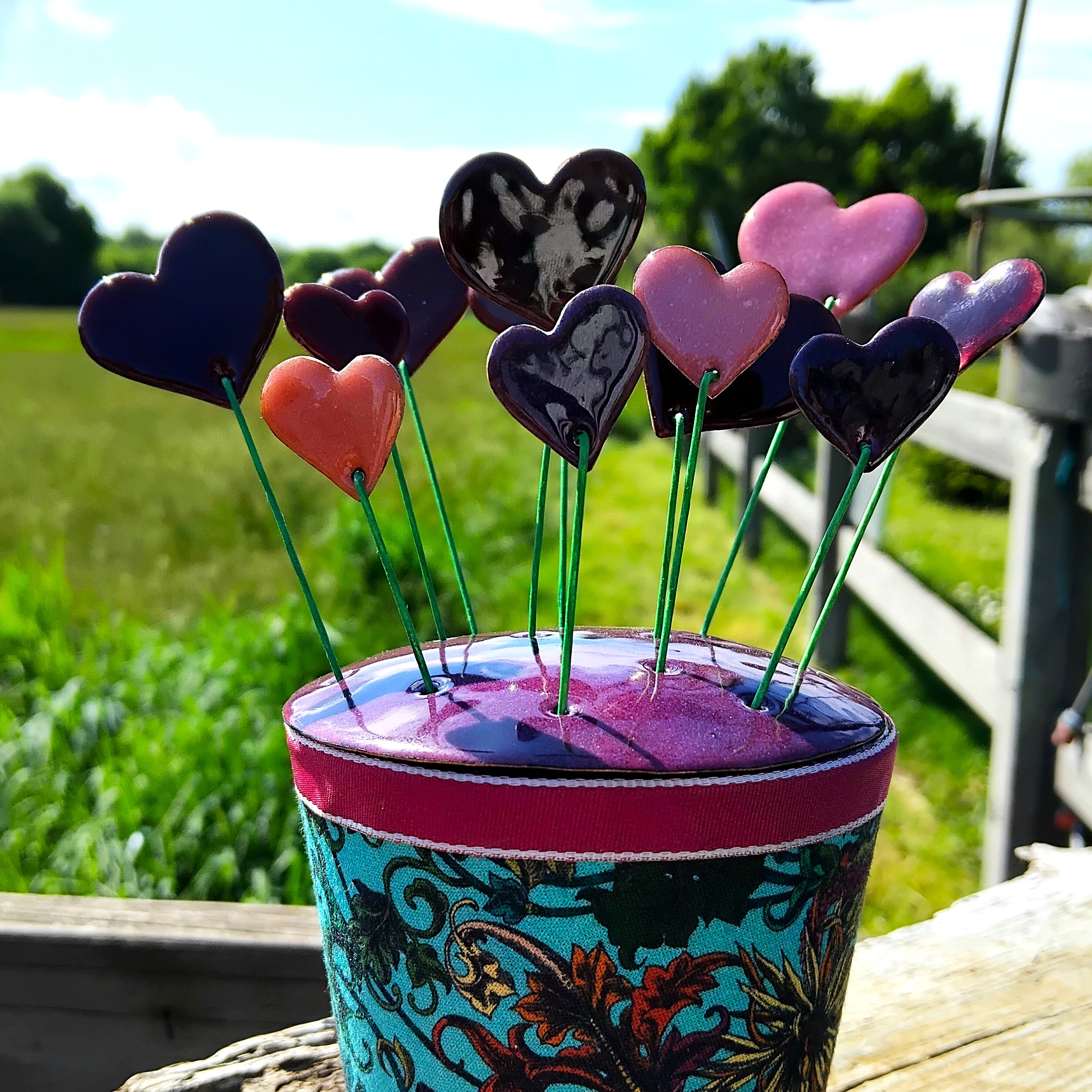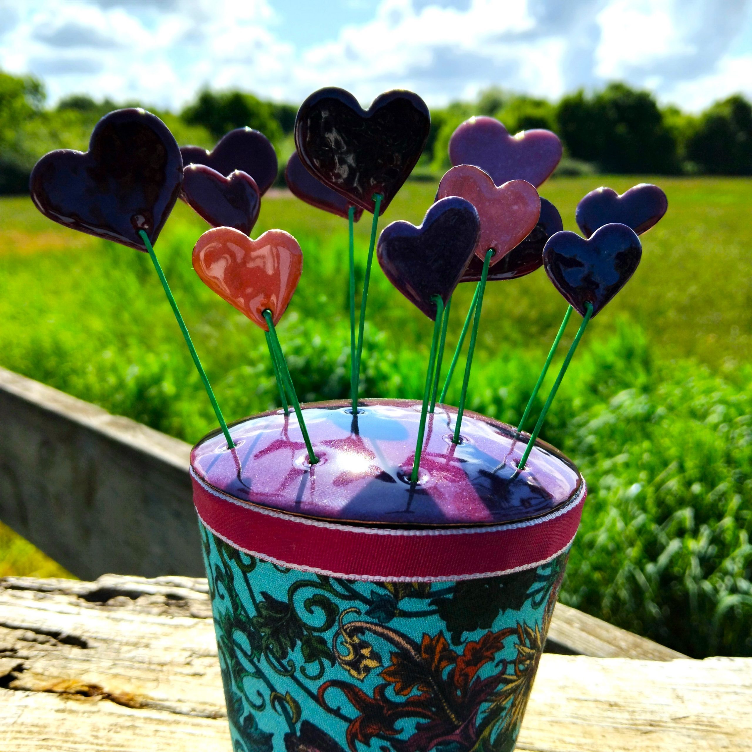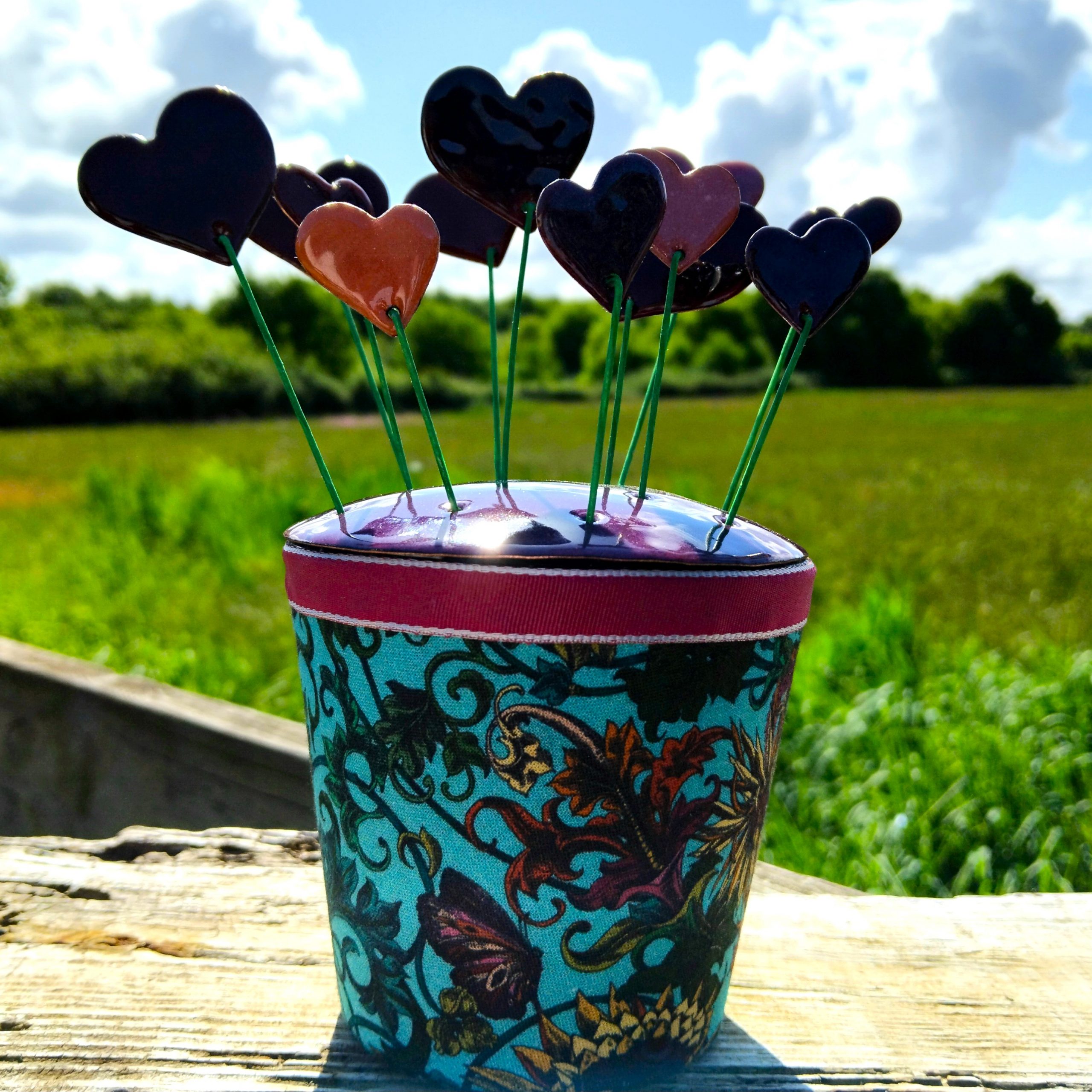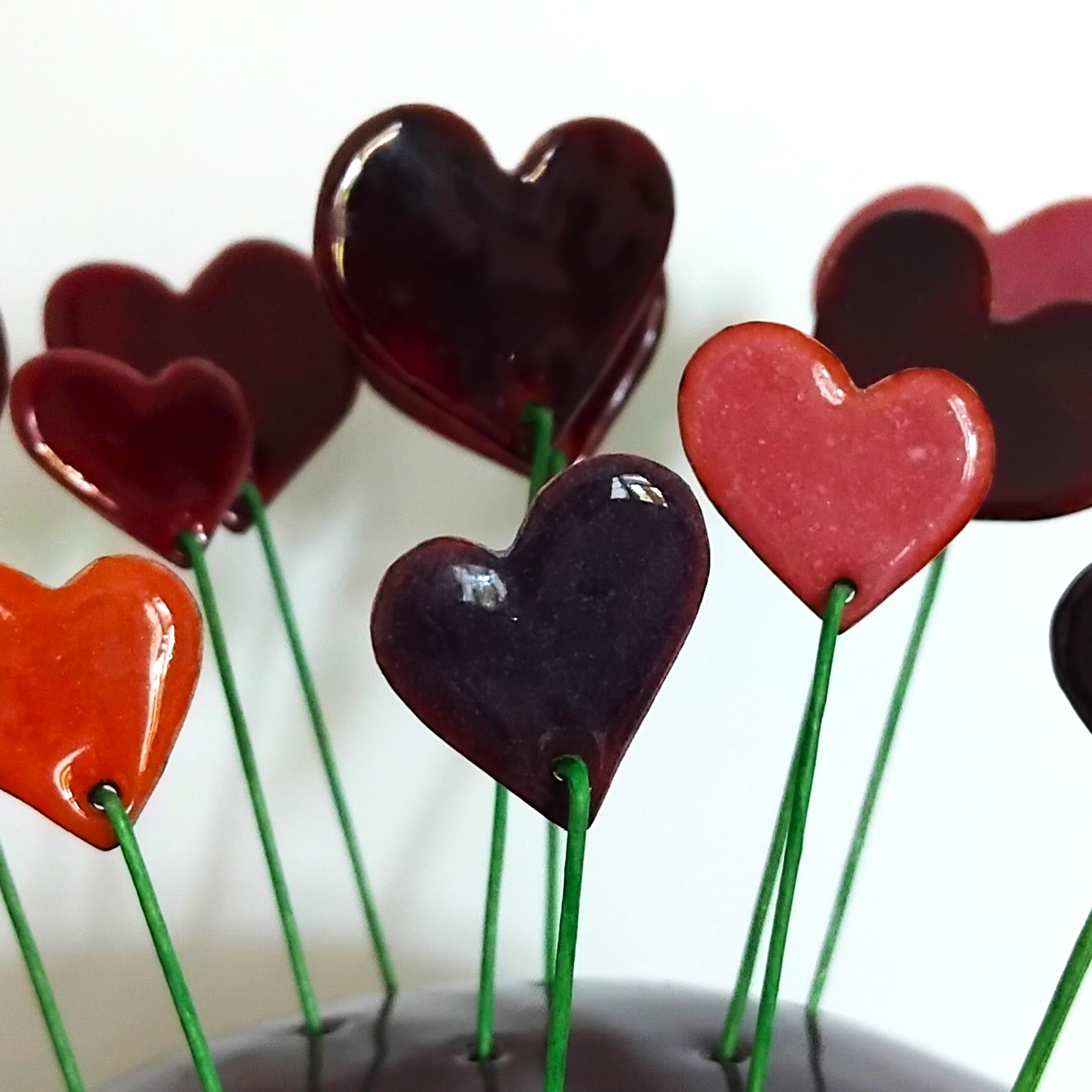 Petit pot recouvert de tissus puis d’un tapis émaillé d’où poussent des petits cœurs émaillés dans un camaïeu rose.