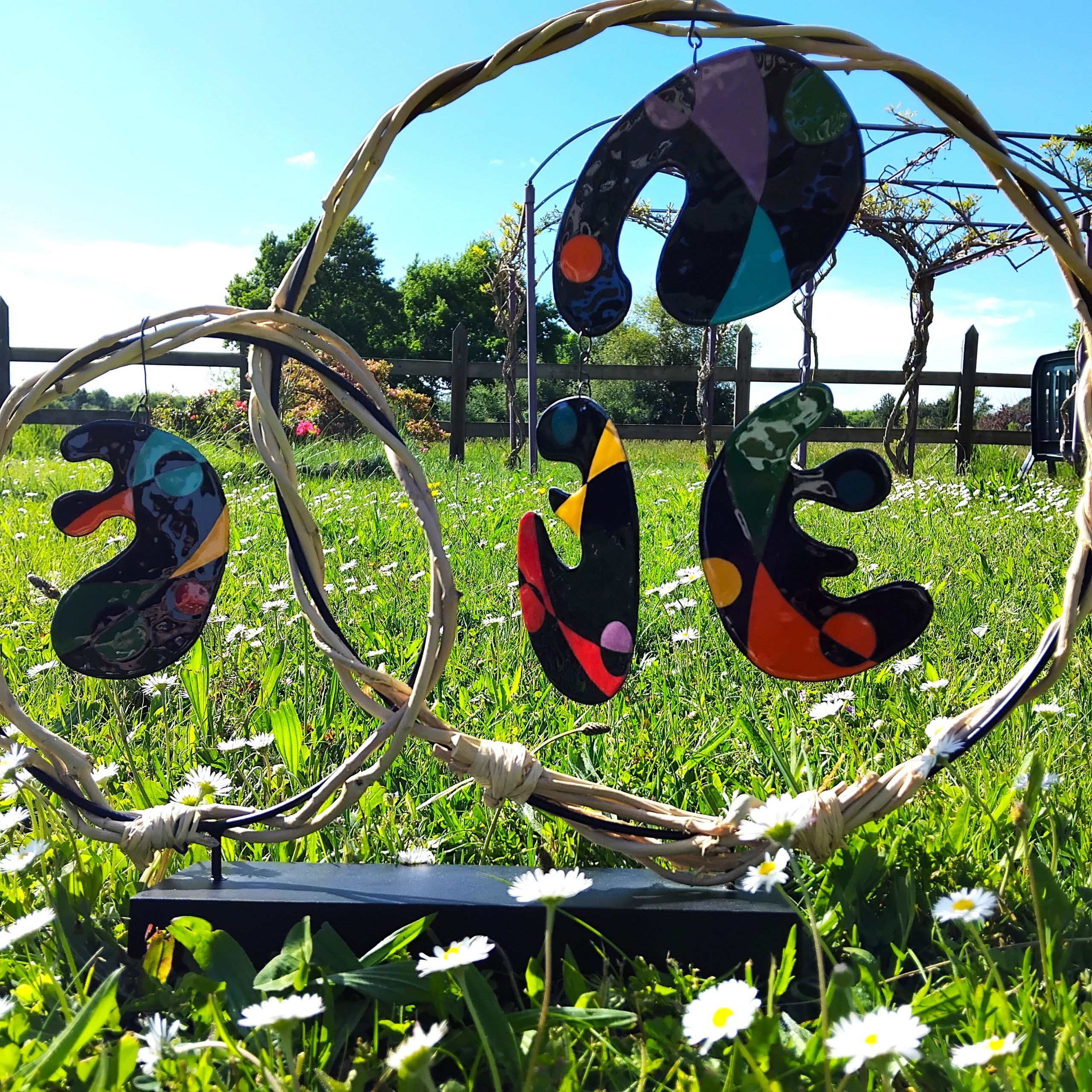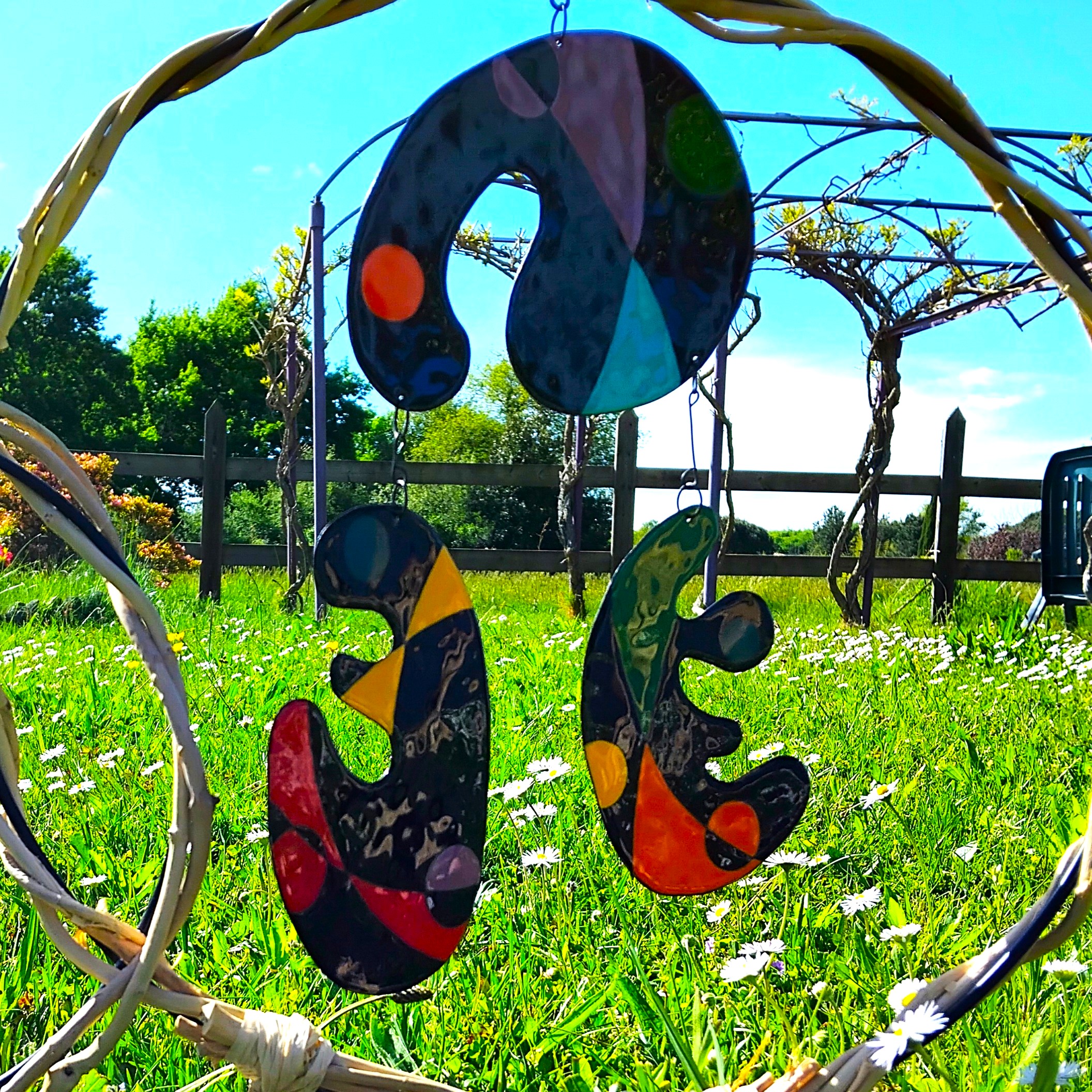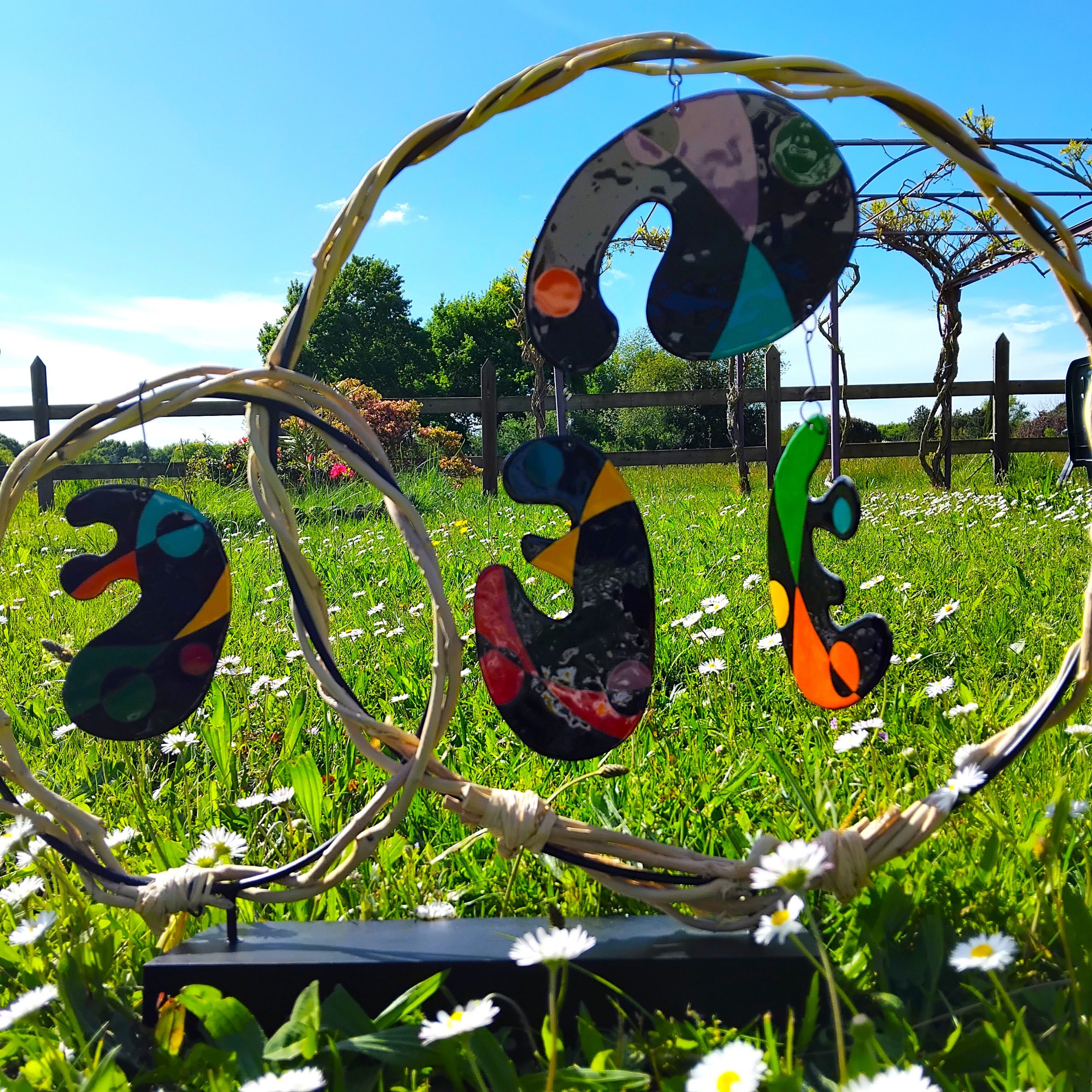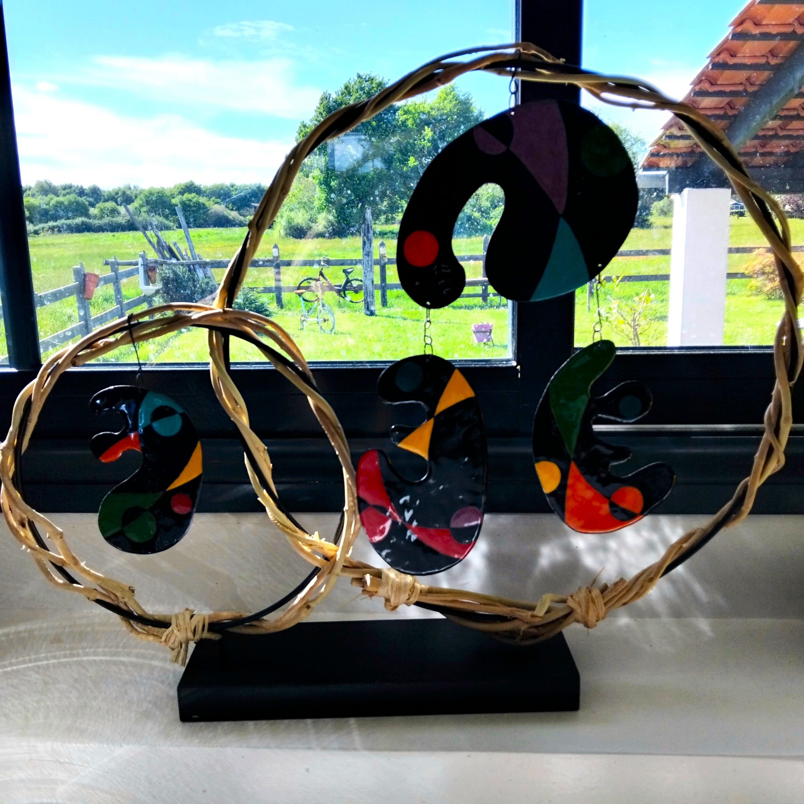 Mobile composé de 4 pièces émaillées suspendues avec des couleurs et des formes des années 70 mais il reste contemporain.