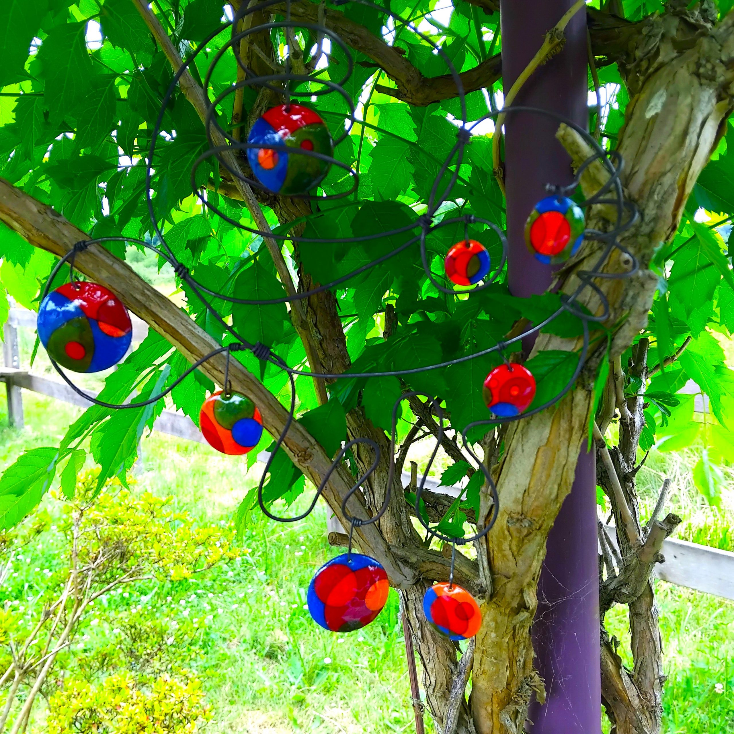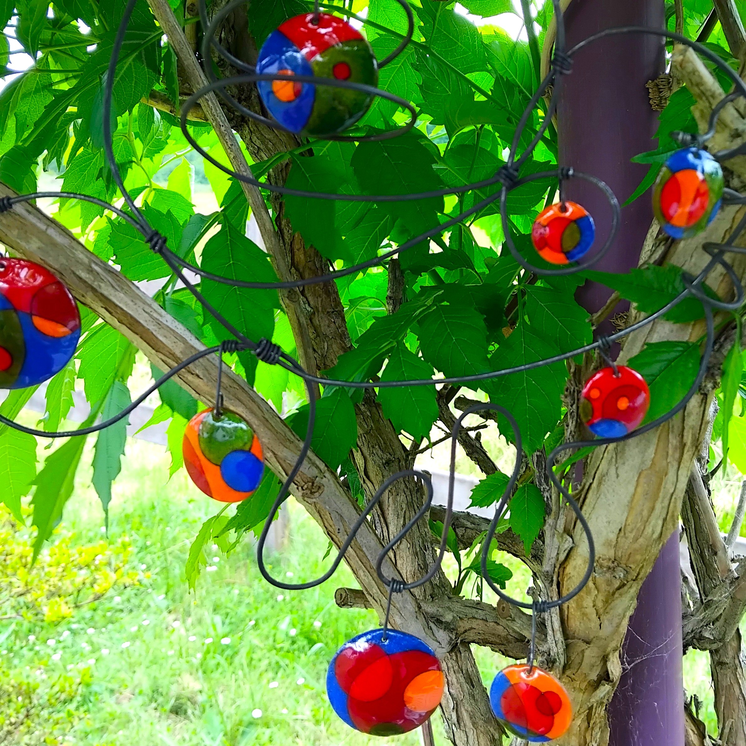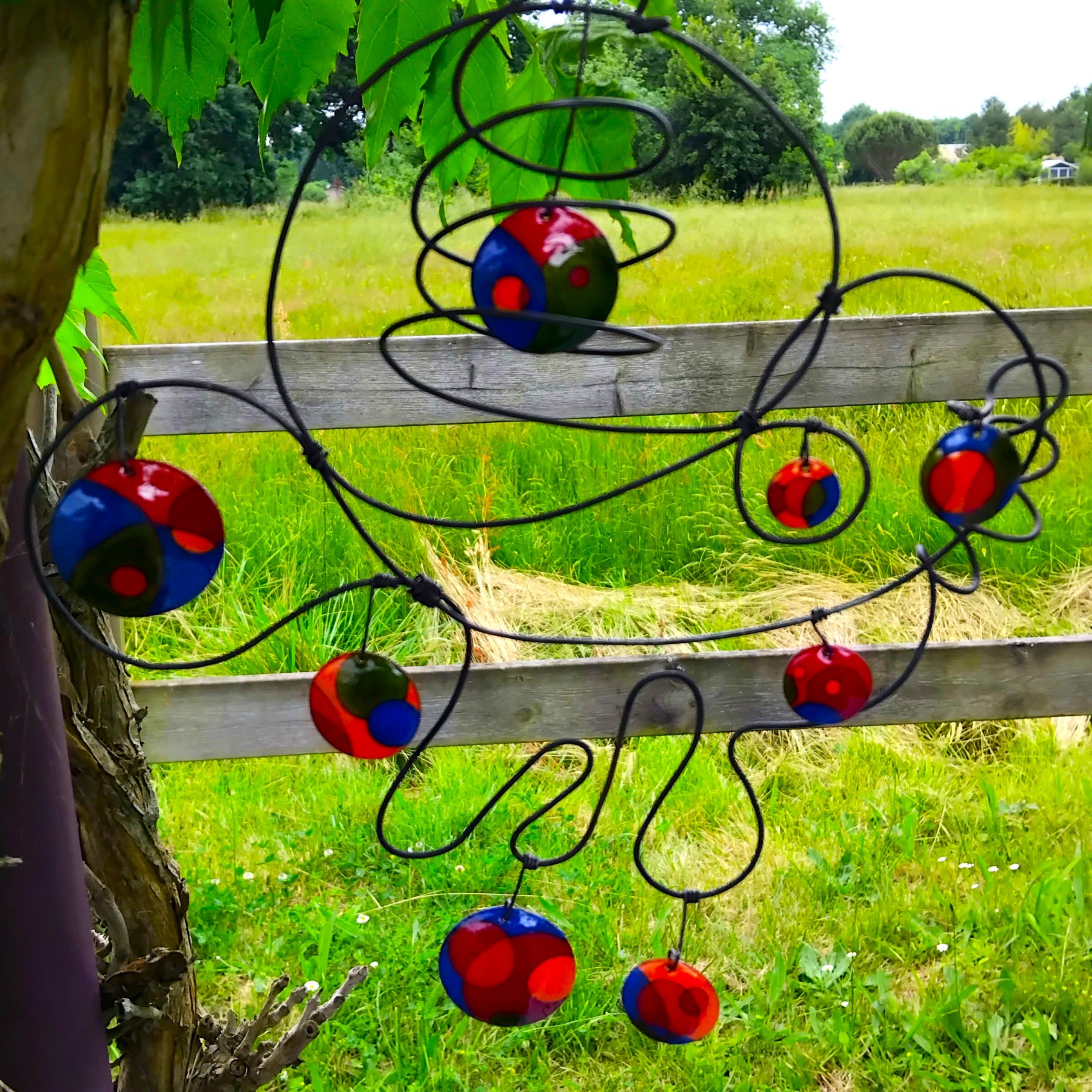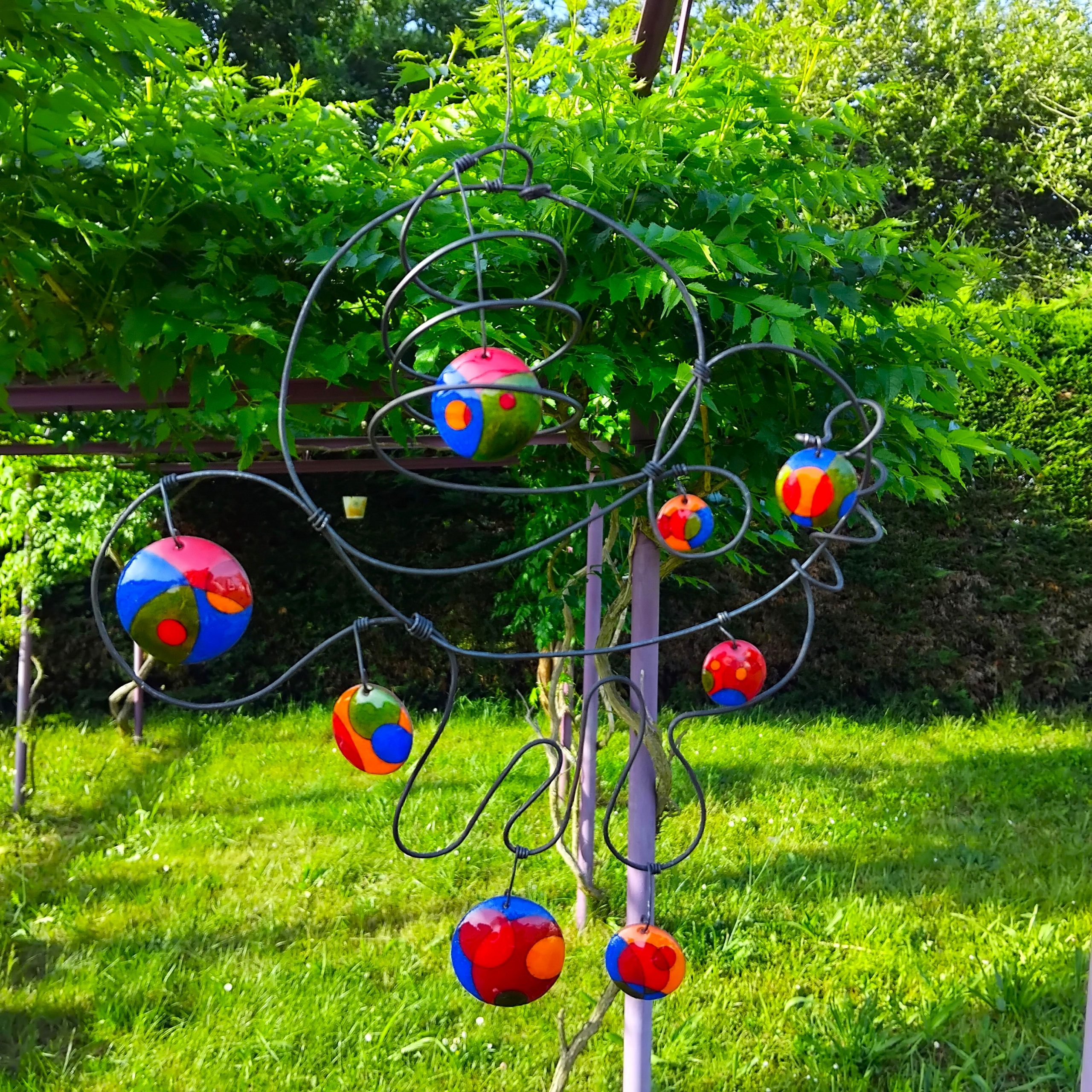 Mobile formé en fil d’acier composé de pastilles émaillées de couleurs toniques.
