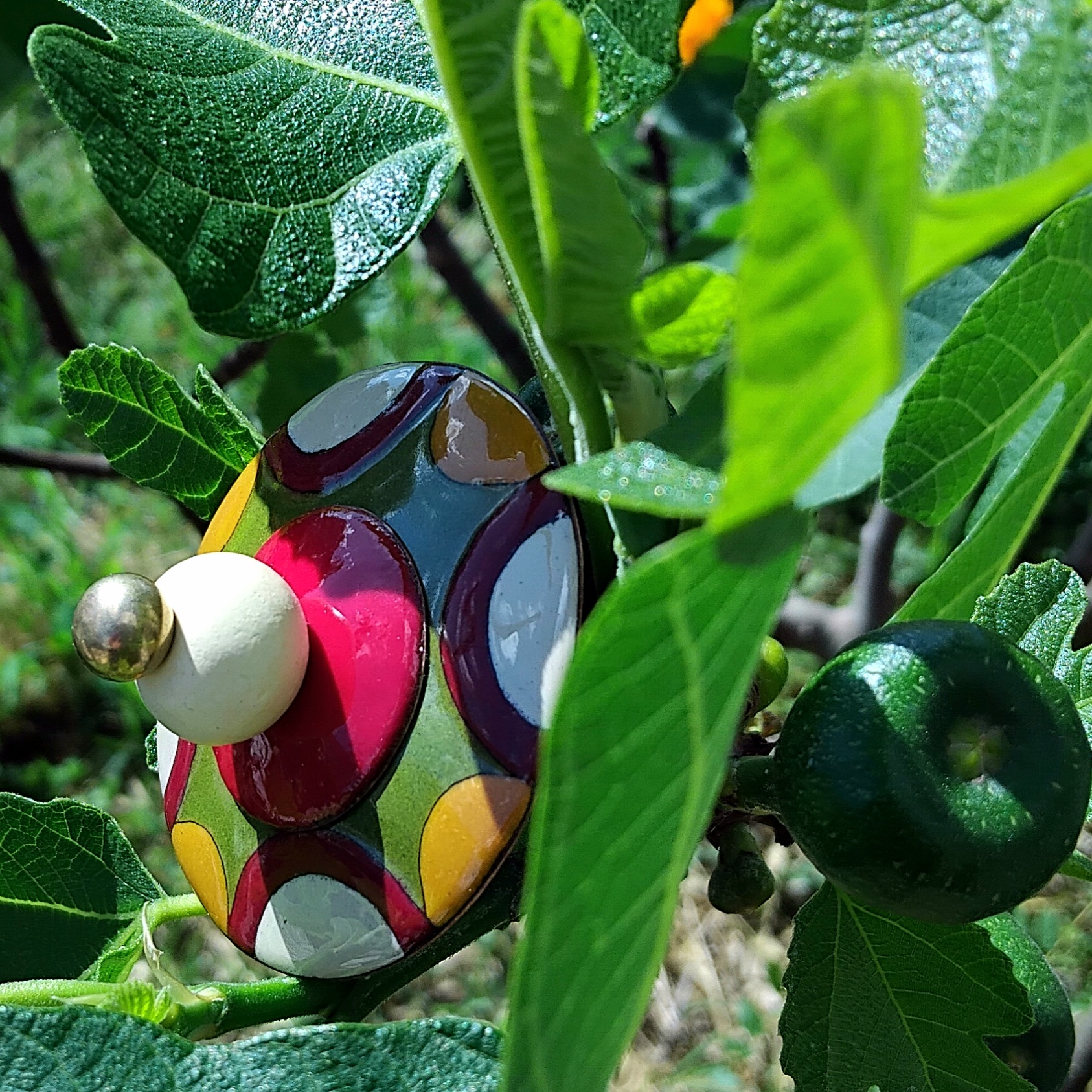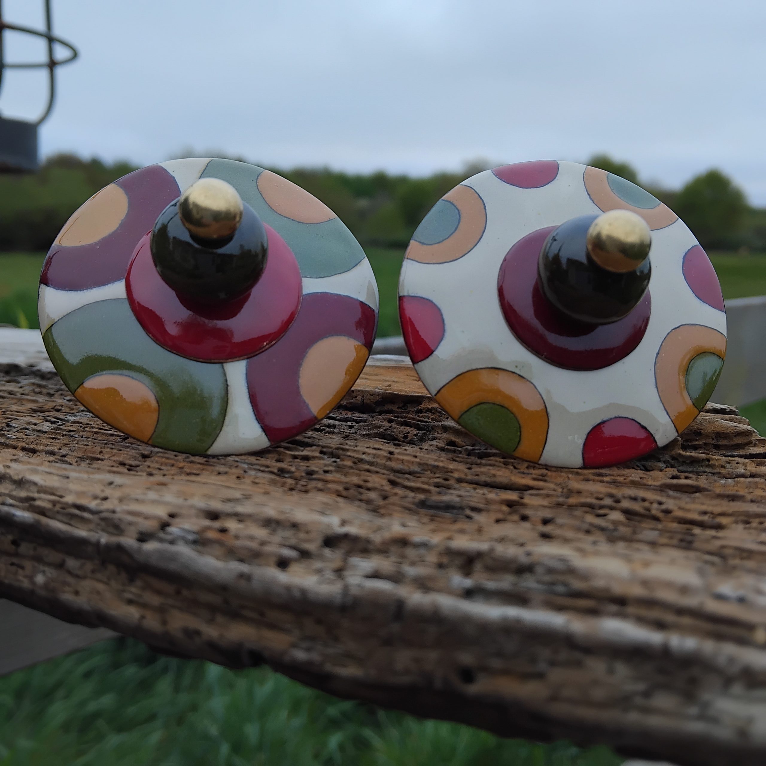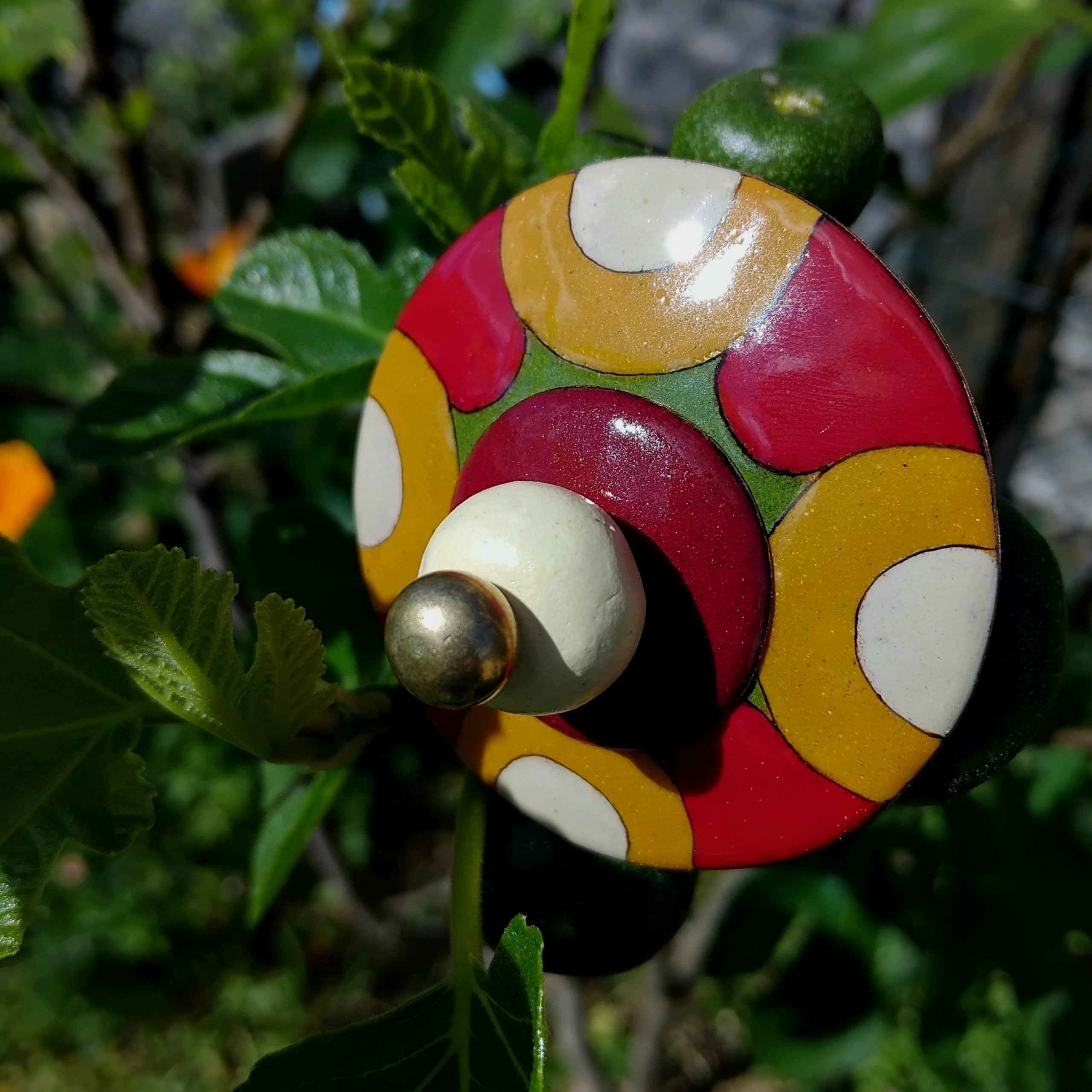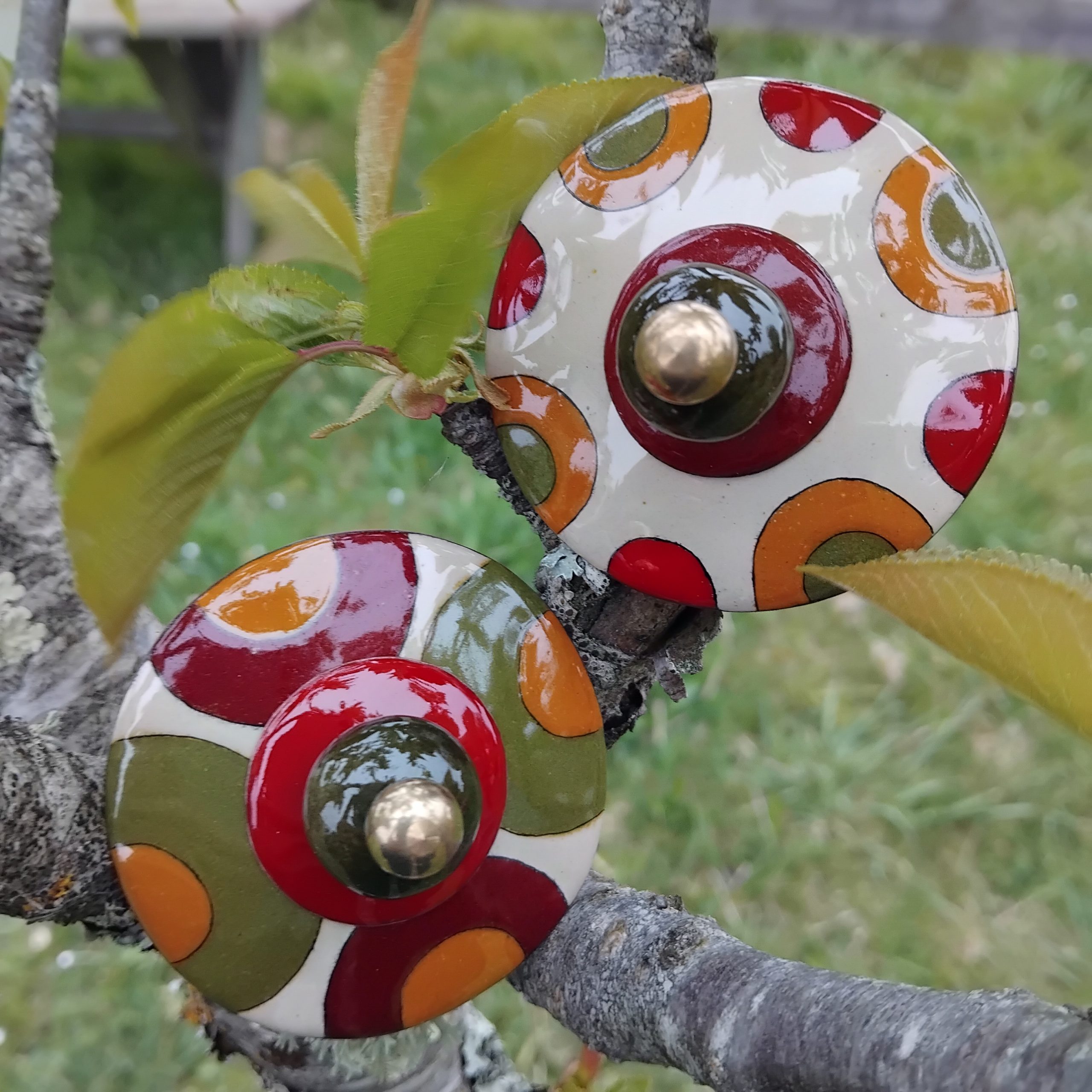 Elles sont composées d’un disque émaillé, d’une perle en céramique et d’une bille en laiton.