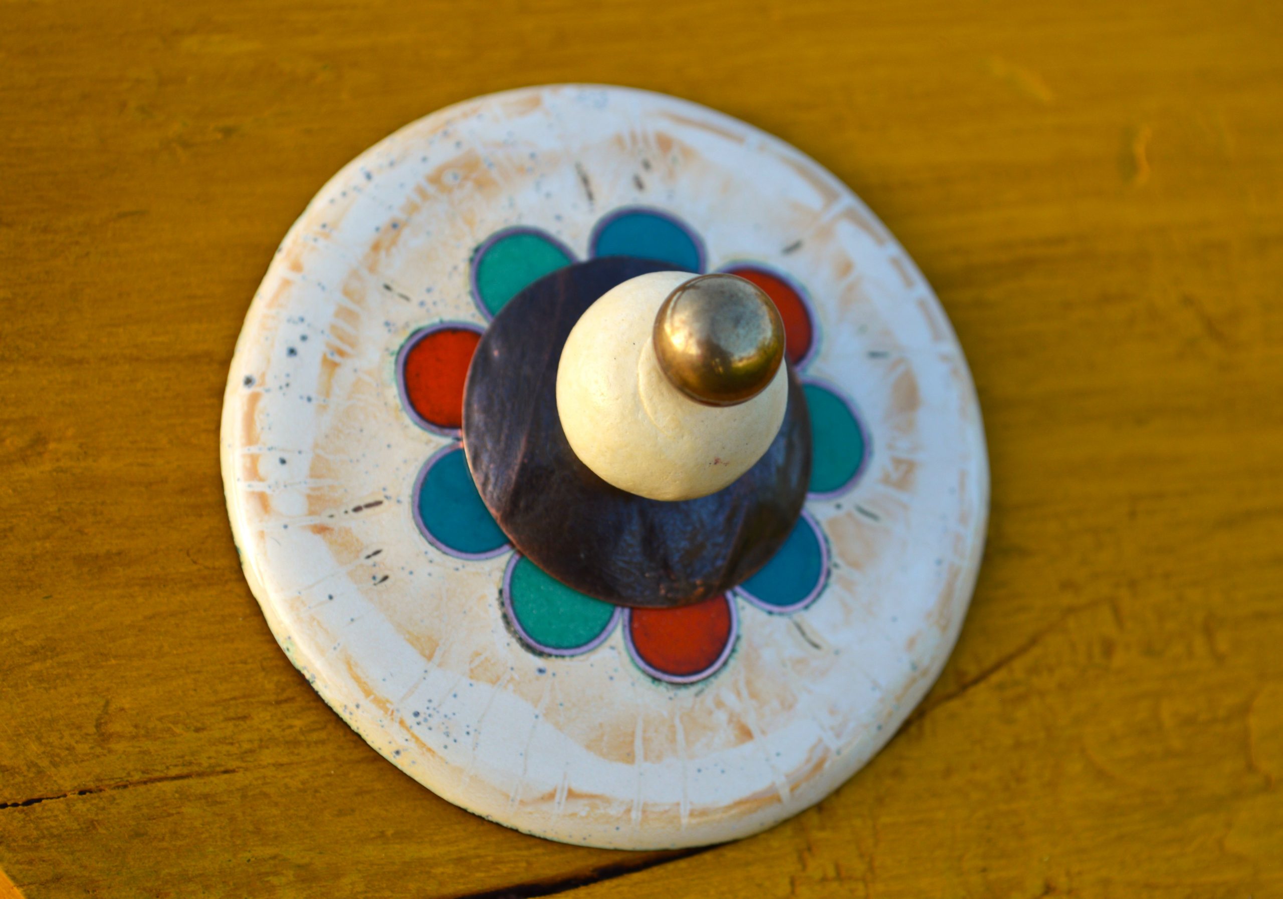 Elle est composée d’un disque émaillé, d’une perle en céramique et d’une bille en laiton.