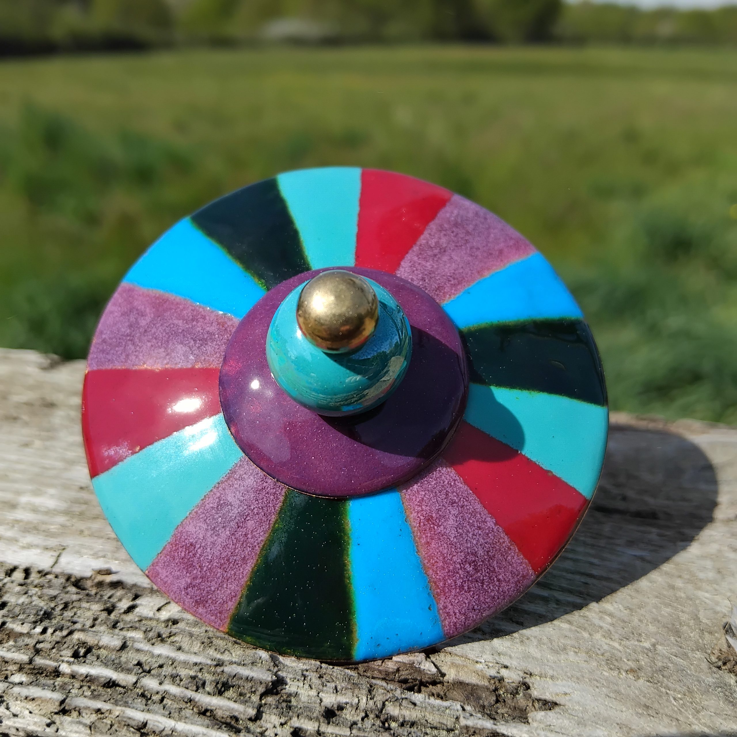Elle est multicolore, composée d’une perle en céramique et d’une bille en laiton.